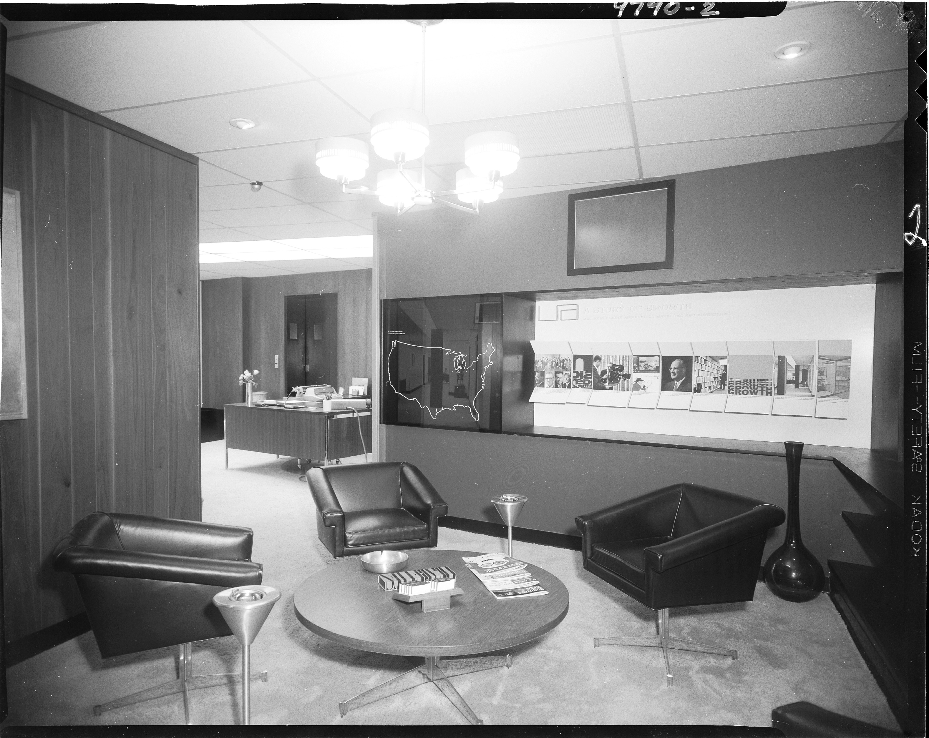 Business Scenes. Interior view of offices of William John Upjohn Associates, 111 Portage Street, Kalamazoo, Michigan. Includes leather chairs, floor vase, and ashtrays with samples of the agency's work on a panel in the background. Client: William John Upjohn Associates (Photographic Negative)