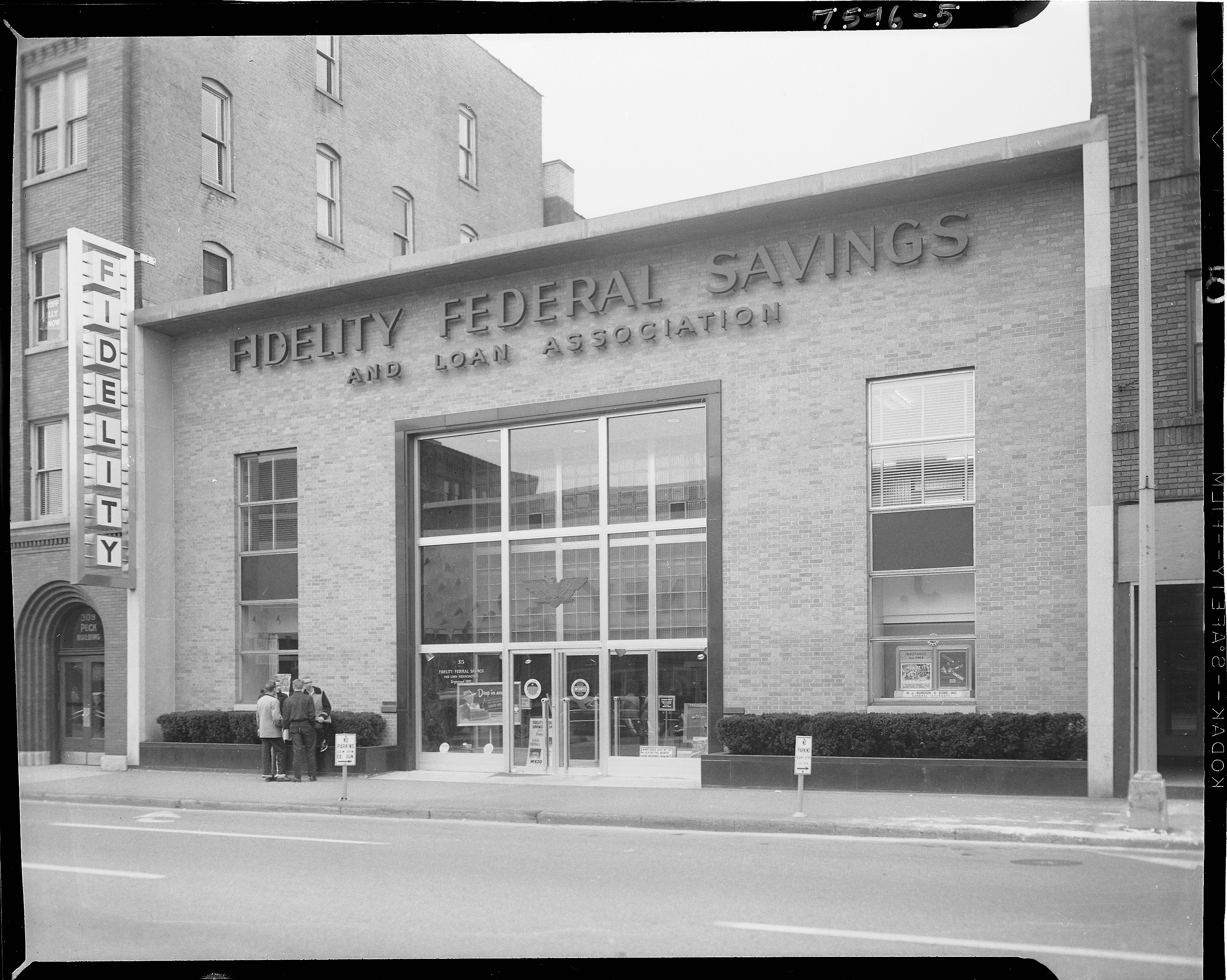 Business Scenes. Fidelity Federal Savings and Loan Association building exterior, 315 S. Burdick. Client: Miller-Davis Company (Photographic Negative)