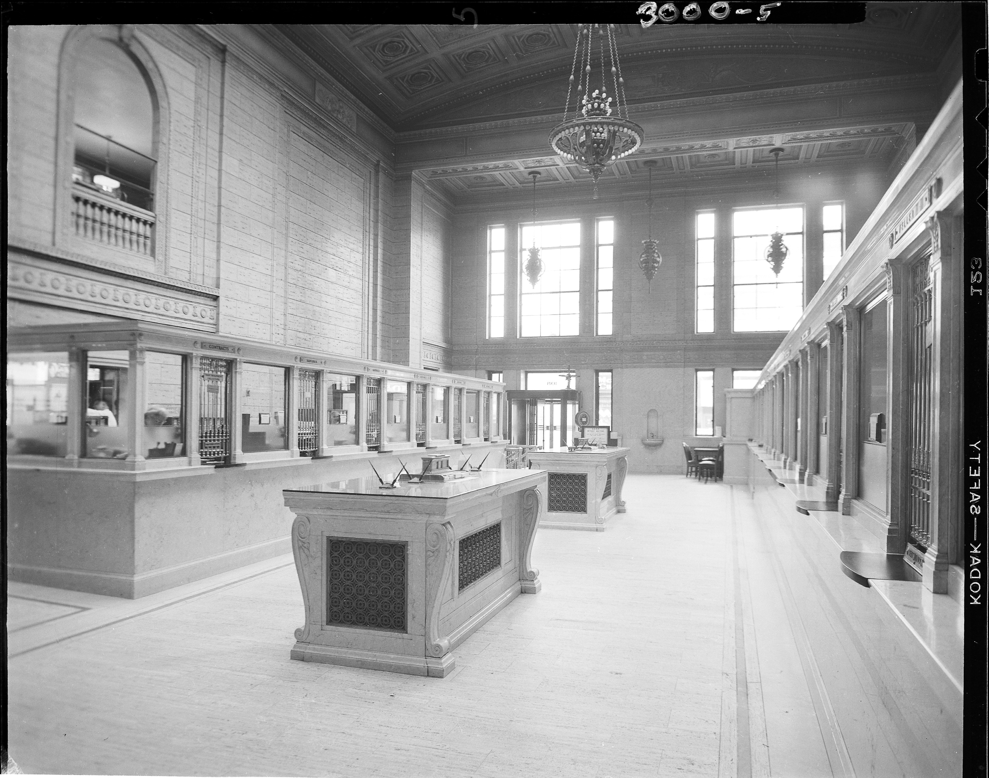 Business Scenes. Interior view of lobby, First National Bank, 106 E. Michigan Avenue, Kalamazoo, Michigan. Includes rows of metal-grilled teller windows, marble countertops, marble floor, marble check-writing islands with decorative metal grilles, marble drinking fountain, revolving glass doors with large metal fan resting on top ledge, decorative arched ceiling, chandeliers, and double row of floor to ceiling windows. Arched balcony seen on second floor above bank teller area. Client: First National Bank, Kalamazoo, Michigan. (Photographic Negative)