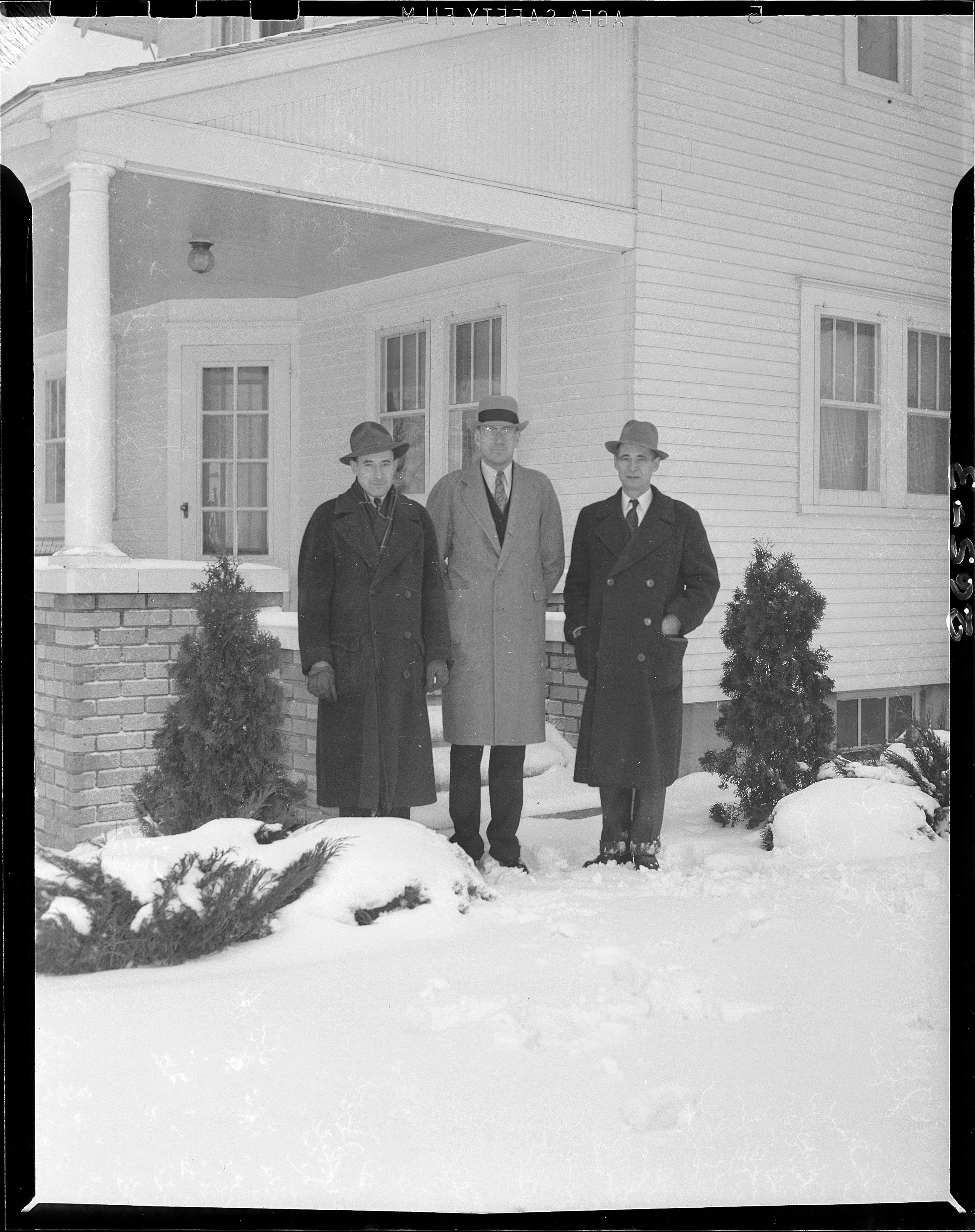 Residential Scenes. People - Daily Life. Three men in overcoats and hats standing in front of porch on Niles and Cecil Hagelshaw Farm, 14340 OP Avenue, Climax, Michigan. Winter Scene. Client: Consumer's Power Co. (Photographic Negative)