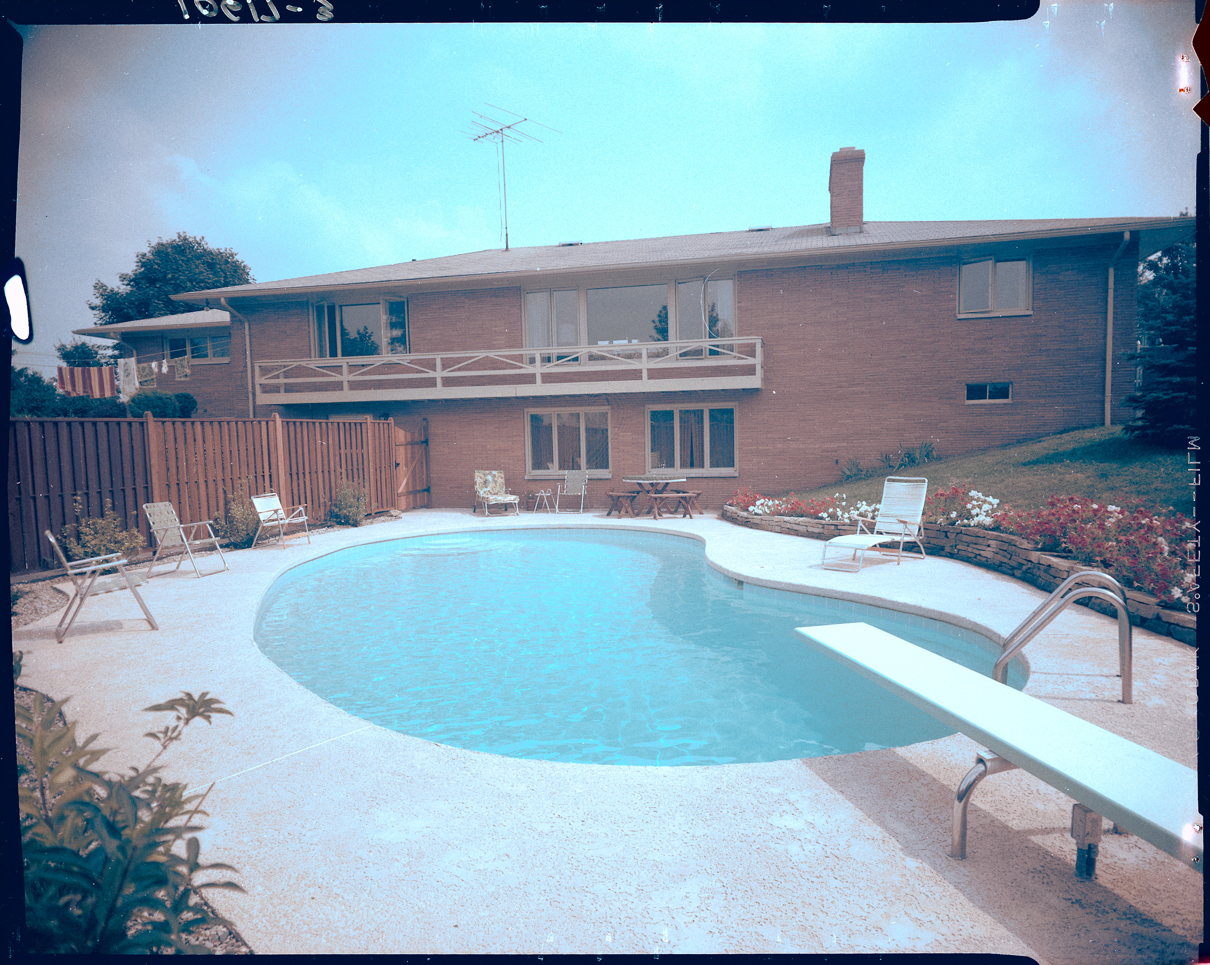 Residential Scenes. Home of Richard and Jane Enslen, 2516 Ferdon Road, Kalamazoo, Michigan. Back yard kidney-shaped swimming pool with diving board. House is brick ranch style. Client: Kalamazoo Swim Pool Company (Photographic Negative)