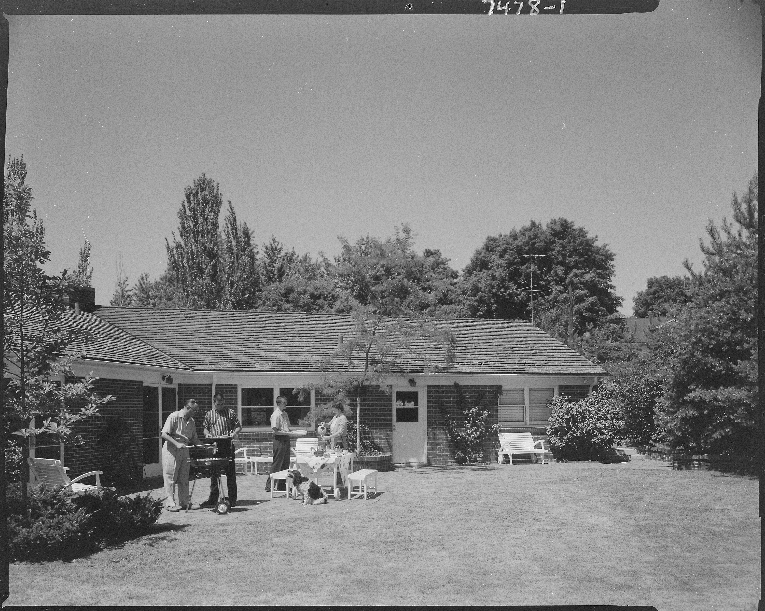Residential Scenes. People - Daily Life. Four people with a dog having a backyard cookout at the home of Robert Britigan, 1734 Embury Road. Lawn furniture, grill and picnic table included in view. Client: Lights Tree Company (Photographic Negative)