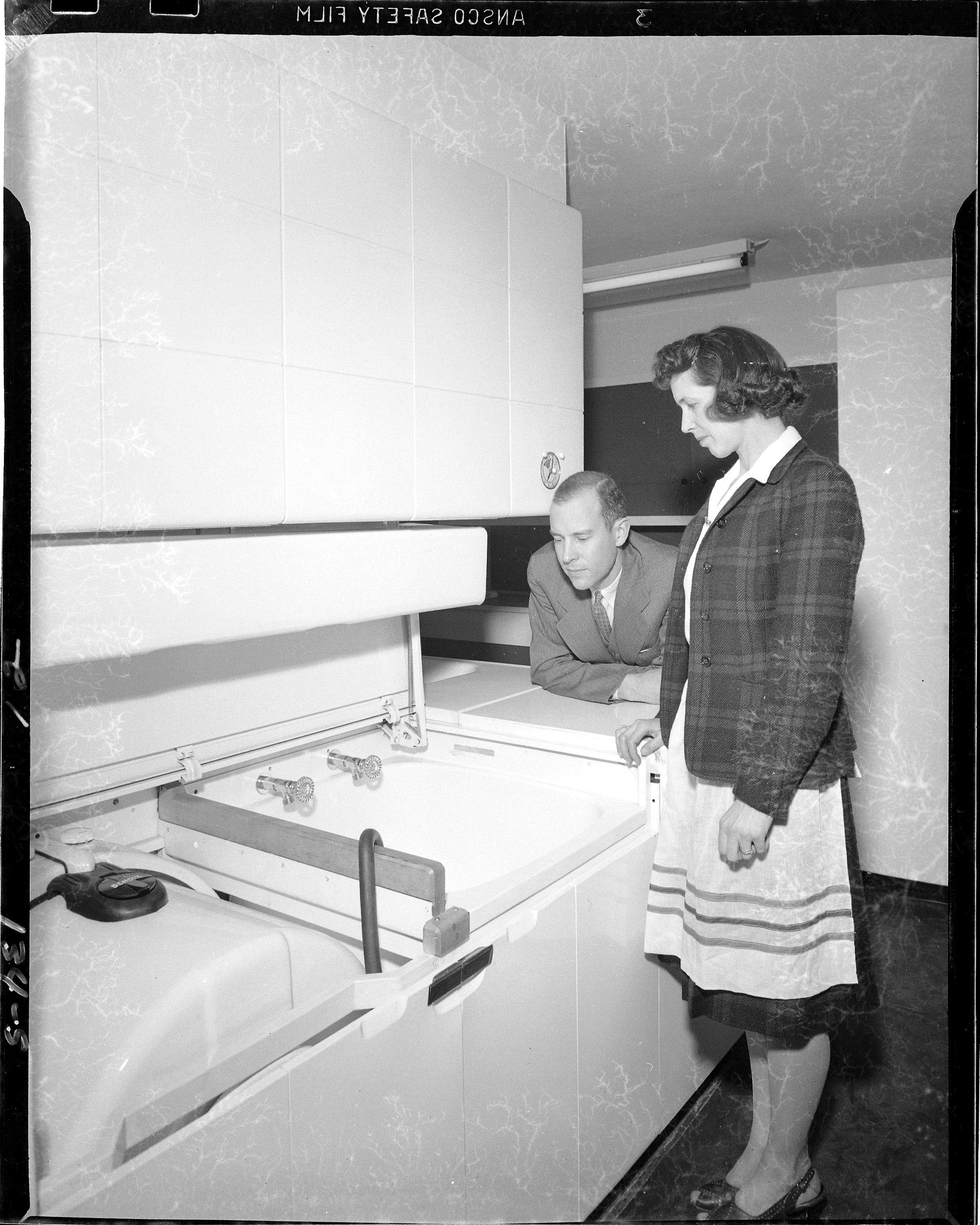 Residential Scenes. People - Daily Life. Woman and man looking at washtub in laundry room. Note: There is a texture on parts of the negative that were not part of the original photograph. This does not minimize the value of the imagery. Client: Trade Development Corp. (Photographic negative)