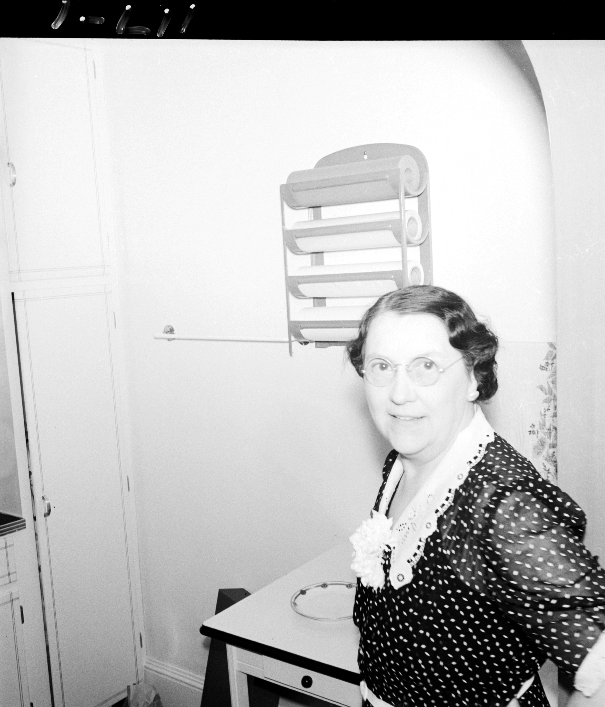 Residential Scenes. Woman in kitchen wearing polka dot dress and glasses. Client: Dave Morris, Kalamazoo, Michigan (Photographic Negative)