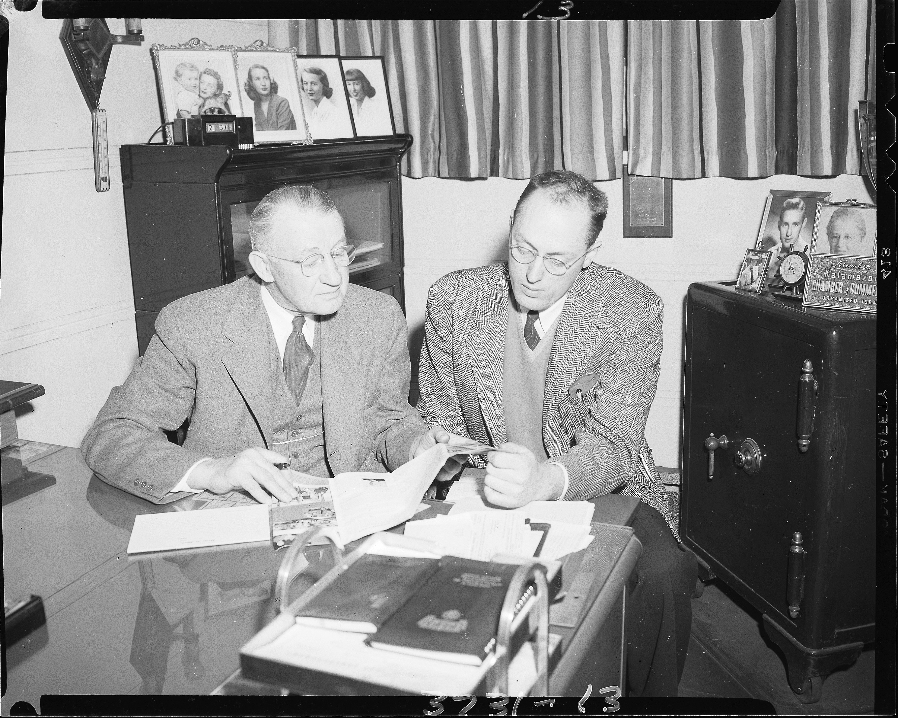 People Working. Two men in suits seated in office and looking over papers. Safe and family photos in background. Client: John P. Koestner Co. (Photographic Negative)