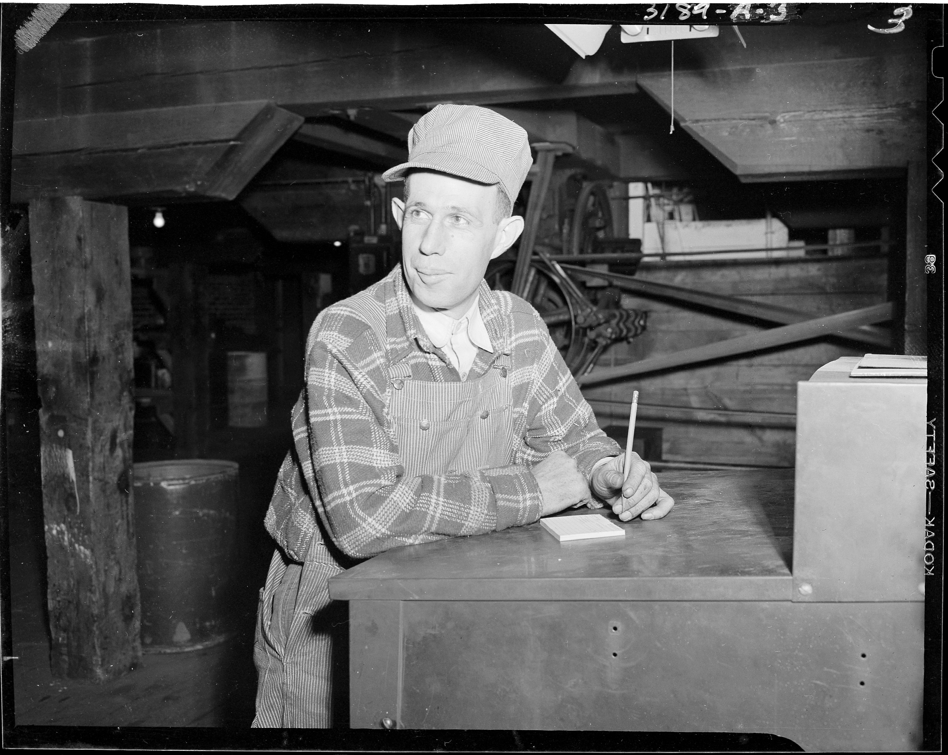People Working. Photos of "old timers" includes employee in overalls and cap, possibly an estimator, with pad and pencil in hand. Client: St. Regis Paper Company, Kalamazoo, Michigan. (Photographic Negative)