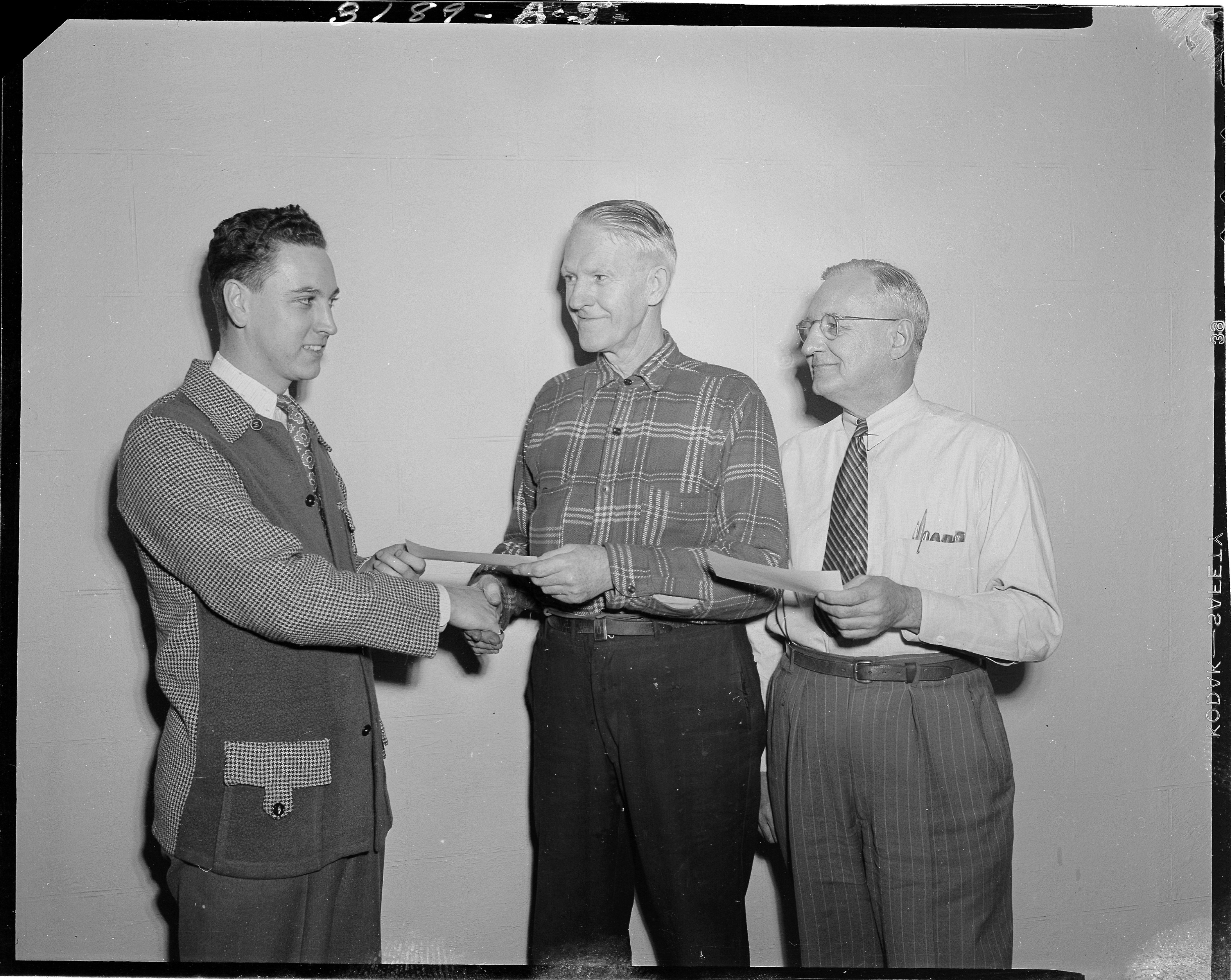 People Working. Photos of "old timers" includes two older men, one identified as Cliff Stuart, presenting a check to a younger man. Client: St. Regis Paper Company, Kalamazoo, Michigan (Photographic Negative)