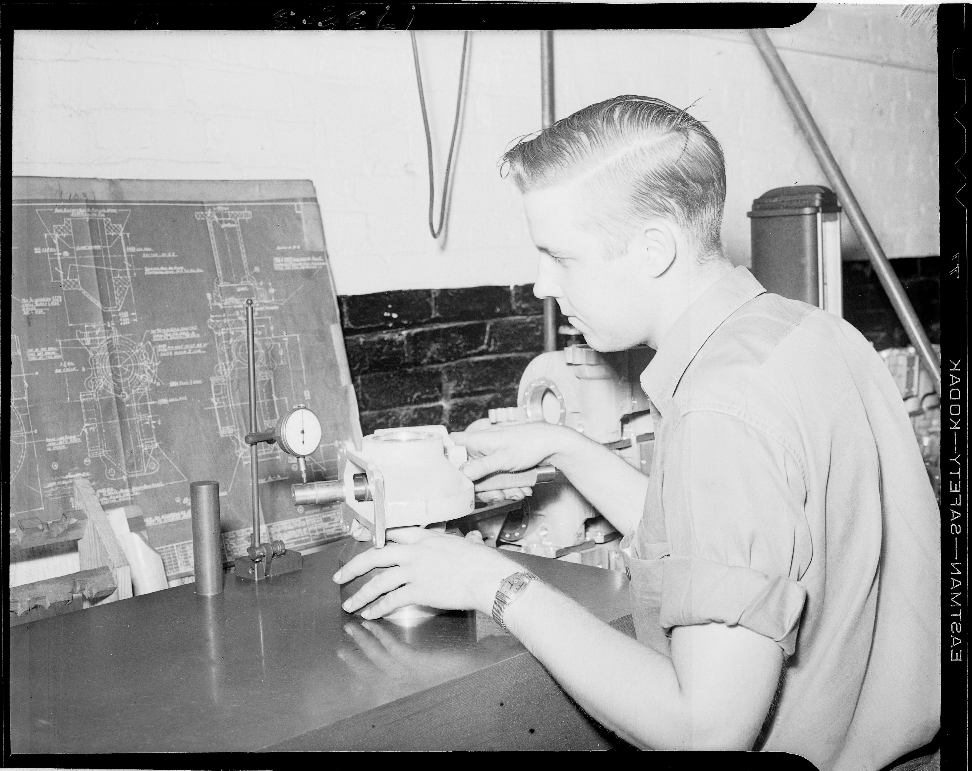 People Working. Industrial Scenes. Man checking industrial part to drawing specifications. Client: Balch Manufacturing Company (Photographic Negative)