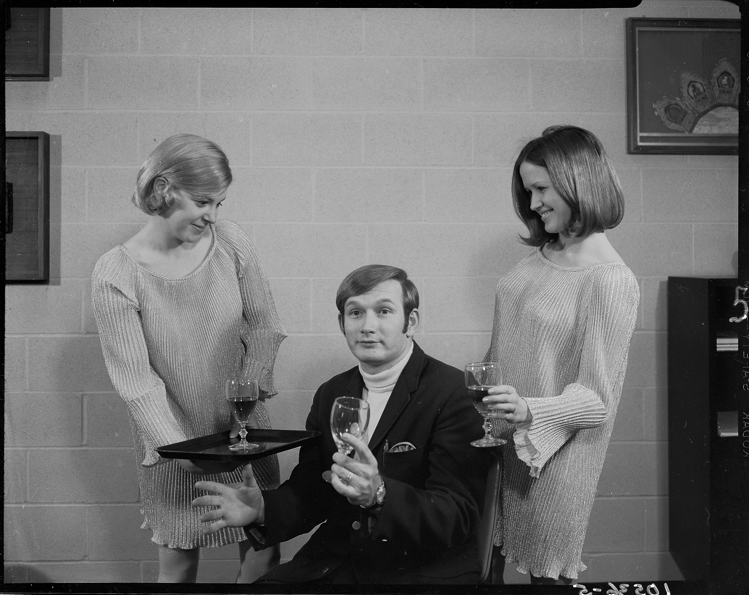 People - Daily Life. Two unidentified women and a man, possibly Brian Donn, posing with wine glasses for the opening of Don Neal's Mr. T-Bone. Client: Don Neal (Photographic Negative)