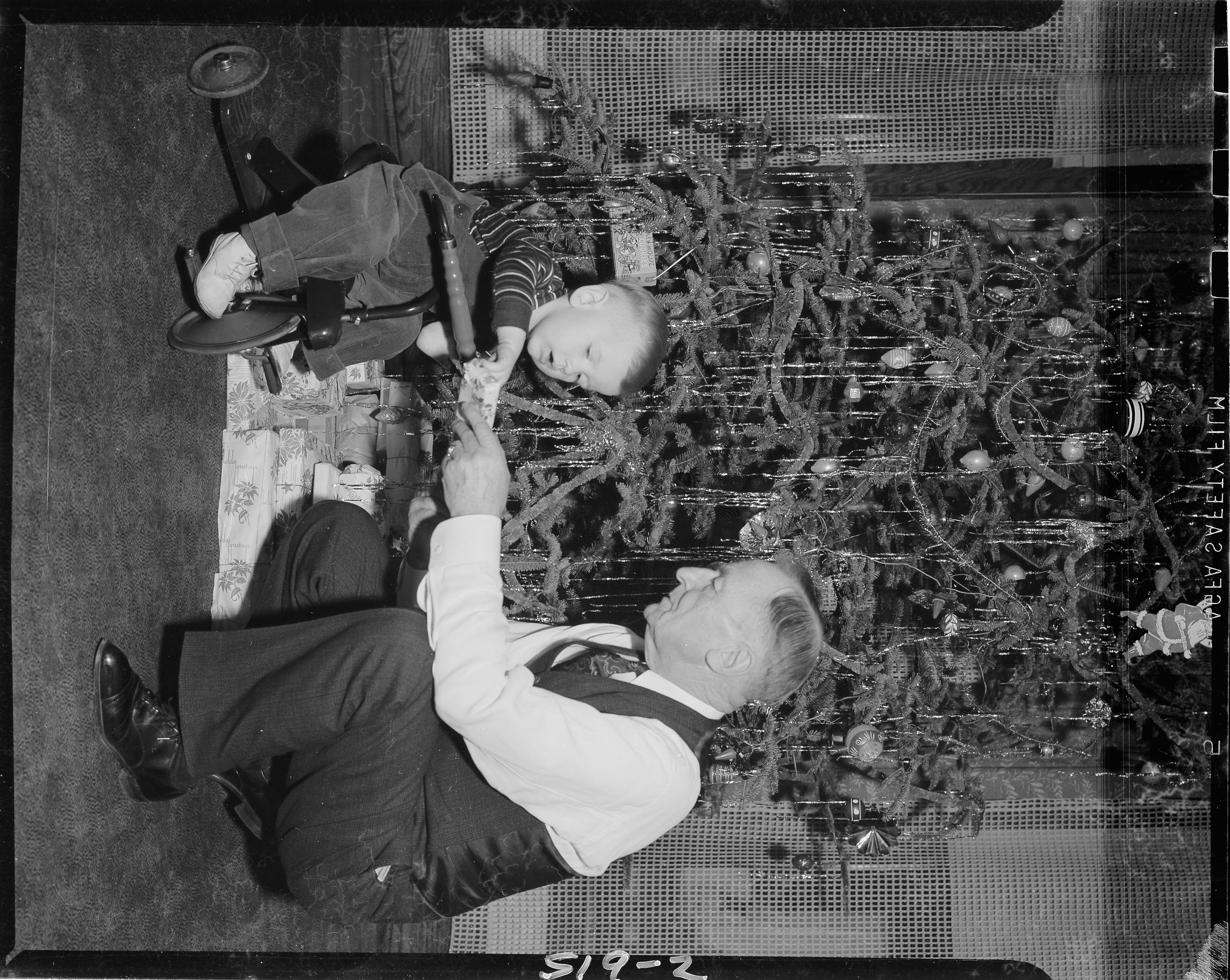 People - Daily Life. Gerrit Vander Meer helping toddler on tricycle near Christmas tree. Client: Mr. Vander Meer (Photographic negative)