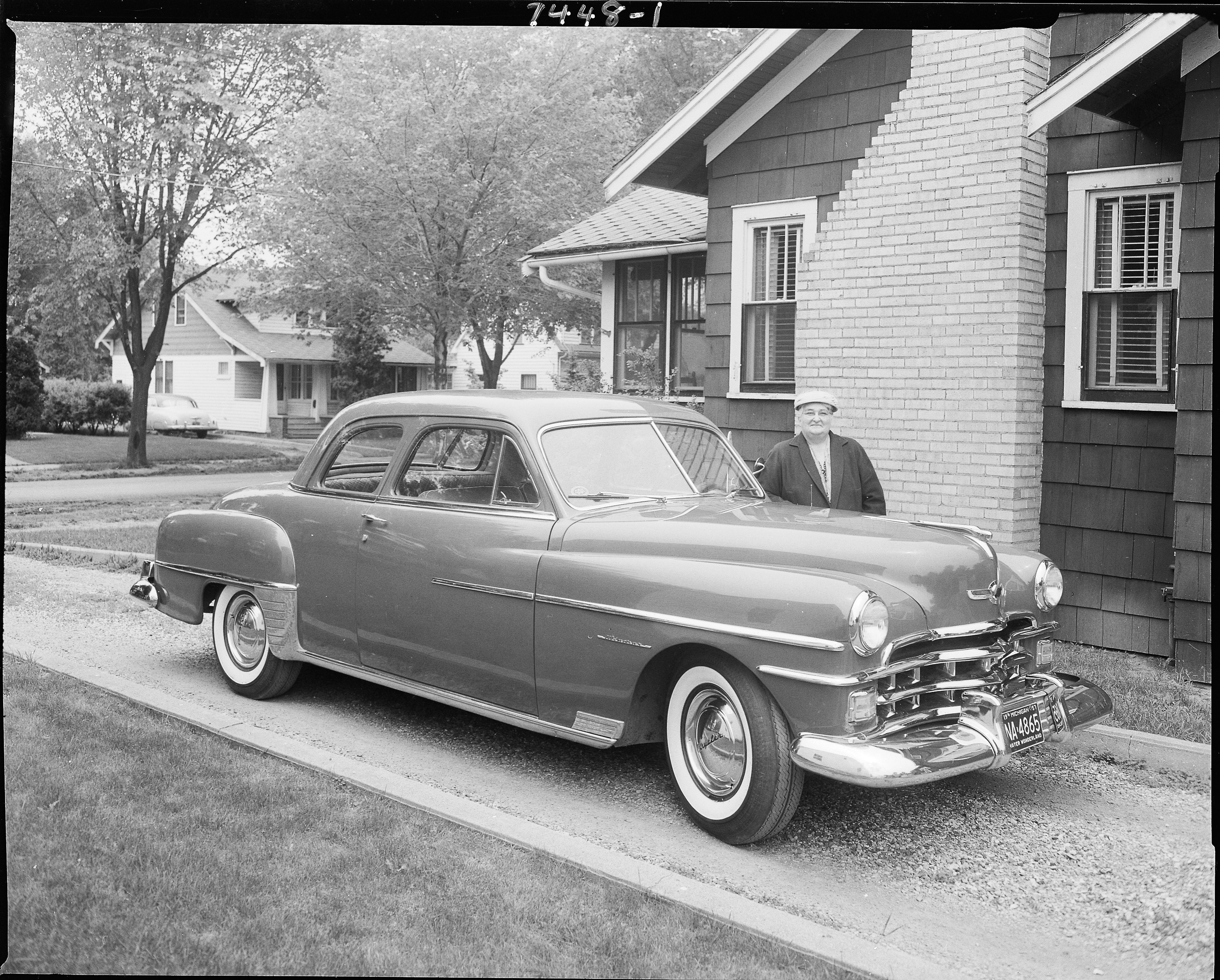 People - Daily Life. Mrs. Grace Deeter and her Chrysler automobile standing by house at 1116 Roseland. 1003 Roseland is in background. Client: Otto Kihm Tire Company (Photographic Negative)