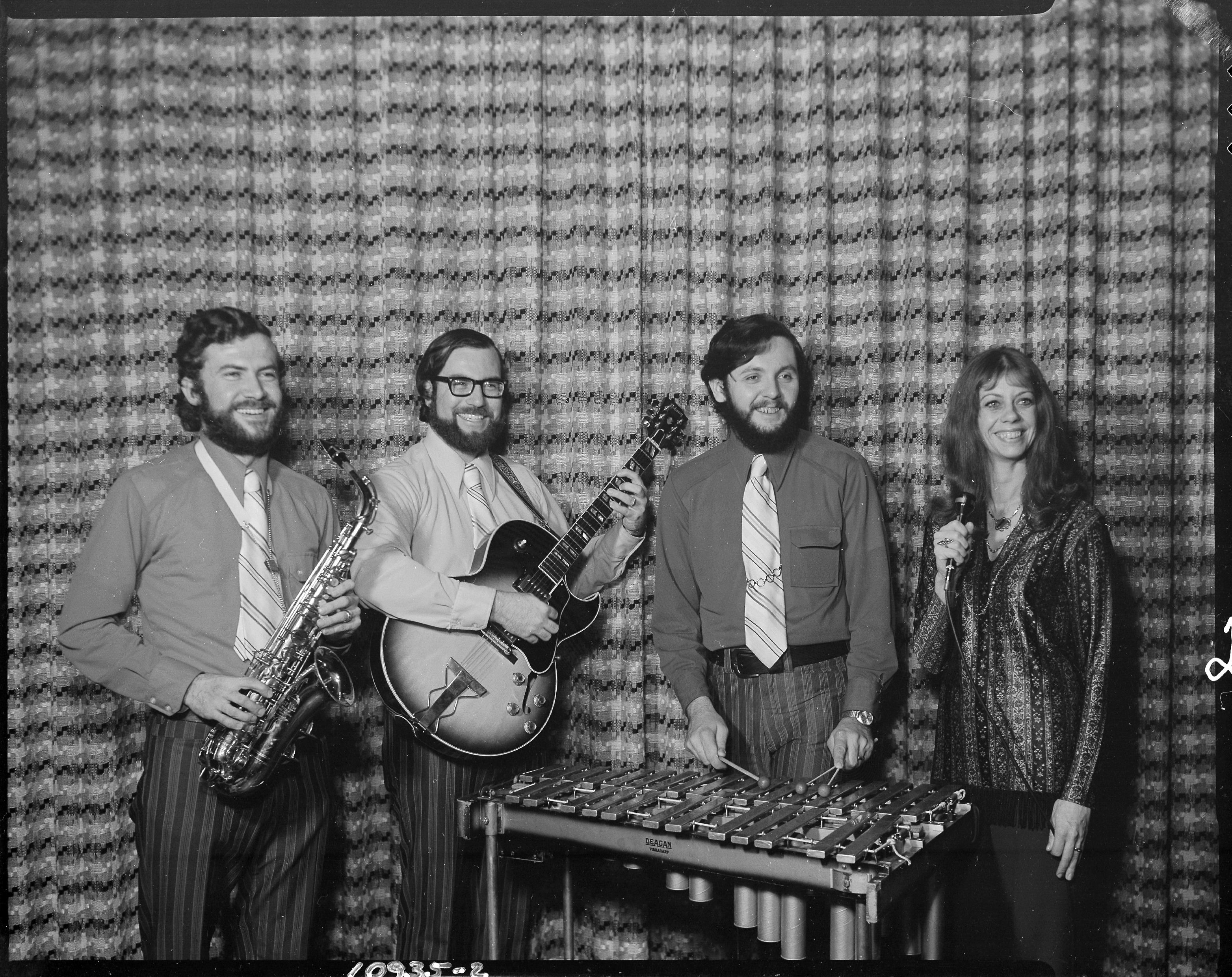 People - Daily Life. Ken Morgan Dance Band featuring Ken Morgan, saxophone, Jim Kaye, Gibson Les Paul Bass Guitar, Al Brown, Deagan VibraHarp, and vocalist Roberta Brown. Client: Ken Morgan Dance Band (Photographic Negative)