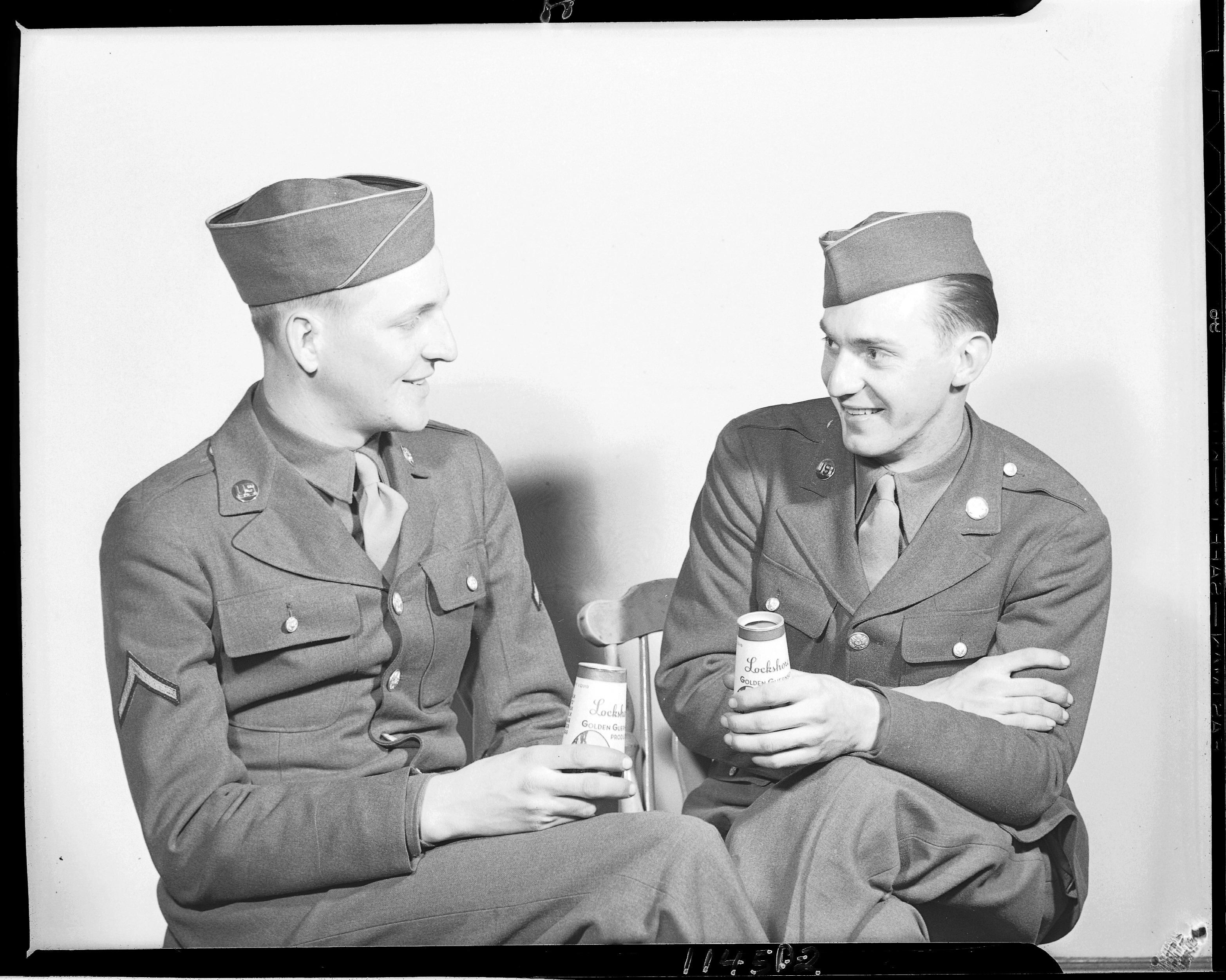 People - Daily Life. Two soldiers in uniform and caps, seated, drinking Lockshore brand milk from half-pint paper milk containers manufactured by Sutherland Paper Company. Client: Sutherland Paper Company, Kalamazoo, Michigan.(Photographic Negative)