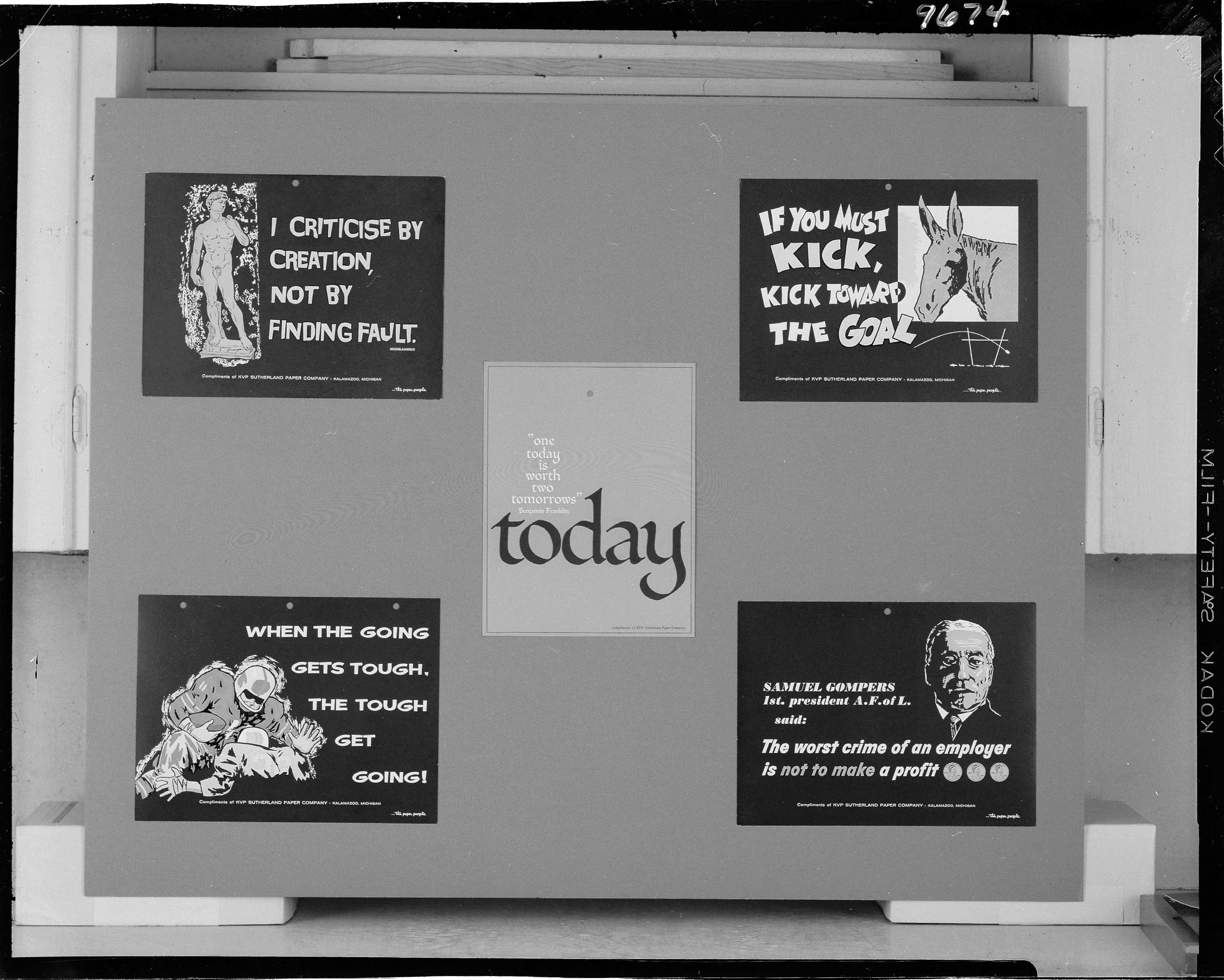 People - Daily Life. Photo of five small signs, motivational mottos for the work environment. Job ordered by Wally Power of Sutherland Paper Company, Kalamazoo, Michigan. Client: Inlander Streindler Paper Company, Chicago, Illinois (Photographic Negative)
