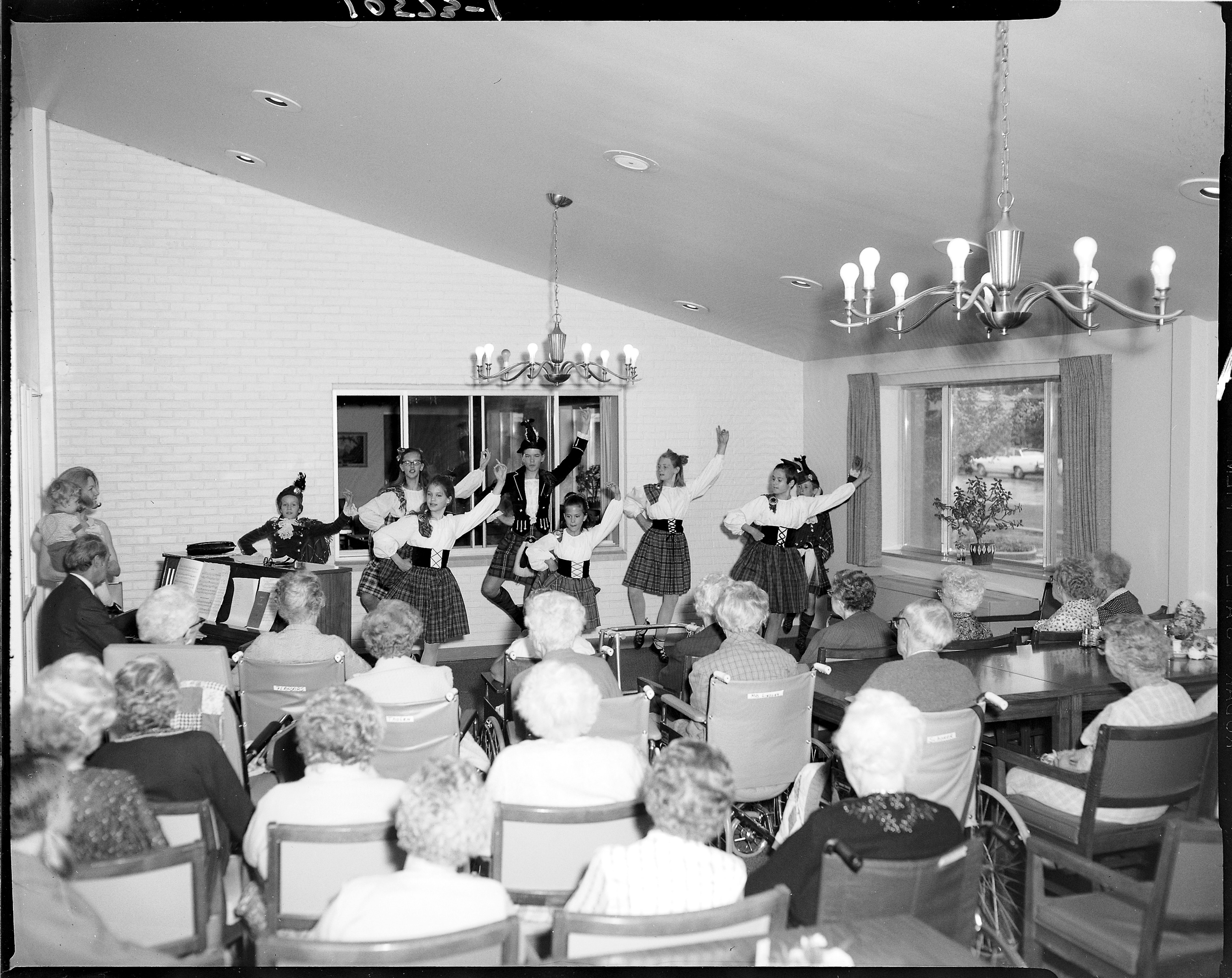 People - Daily Life. Scottish dancers perform for residents of Harold and Grace Upjohn Community Nursing Home. Kalamazoo, Michigan. May 1969. Client: Senior Citizens Home (Photographic Negative)
