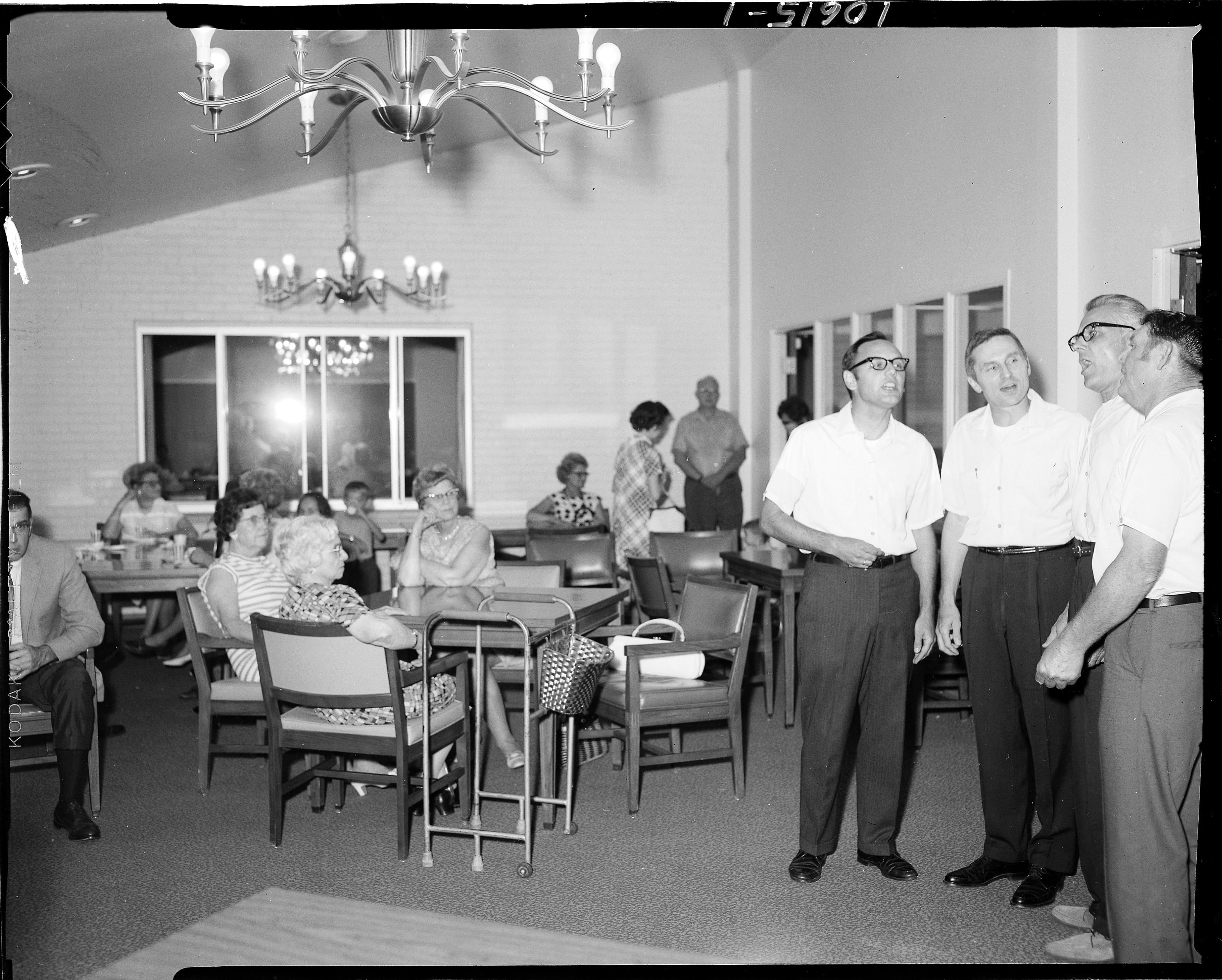People - Daily Life. Four male performers singing in dining area of the Harold & Grace Upjohn Community Nursing Home as residents watch. Kalamazoo, Michigan. August 1969. Client: Senior Citizens Home (Photographic Negative)