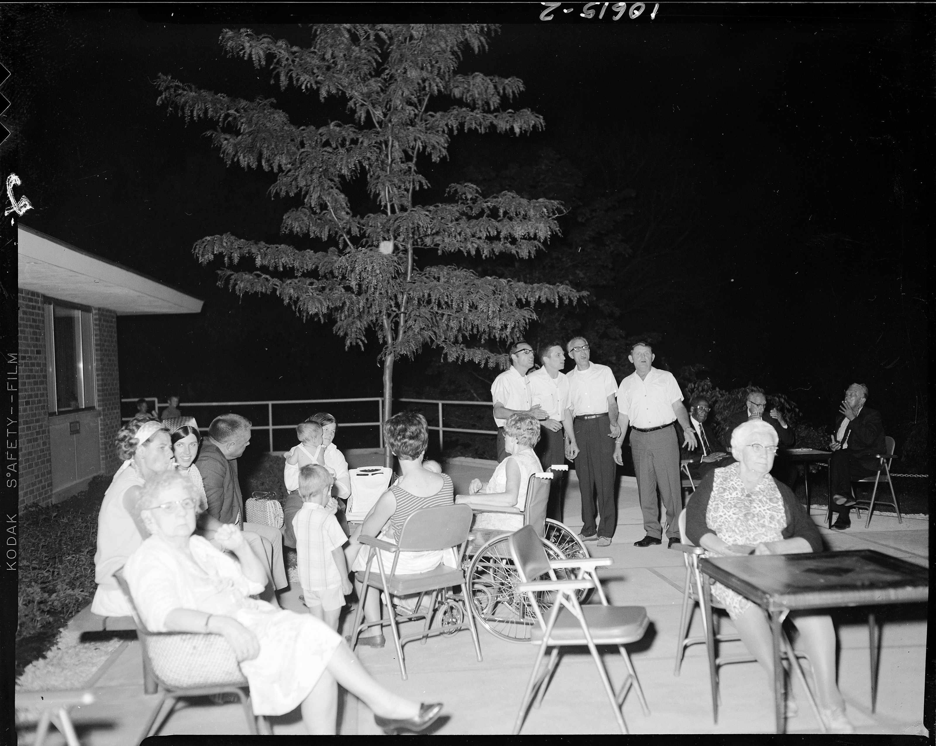 People - Daily Life. Four male performers singing in patio area for residents and families, Harold & Grace Upjohn Community Nursing Home. Kalamazoo, Michigan. August 1969. Client: Senior Citizens Home (Photographic Negative)