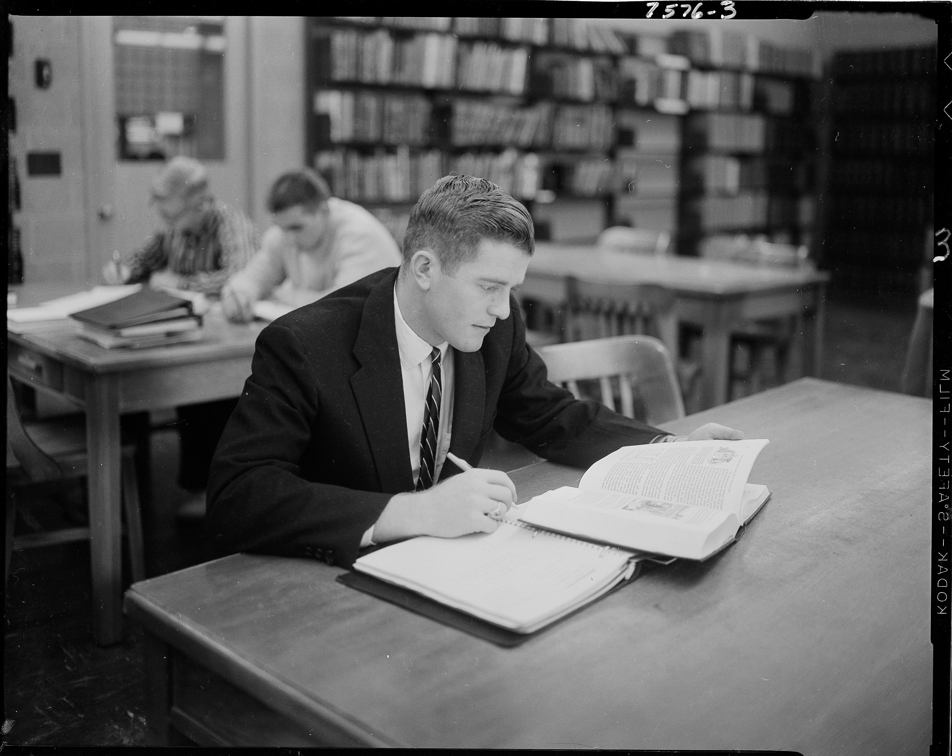 People - Daily Life. People Working. Education. Unidentified student in library. Client: Ohio Oil Co., Findlay, Ohio (Photographic Negative)