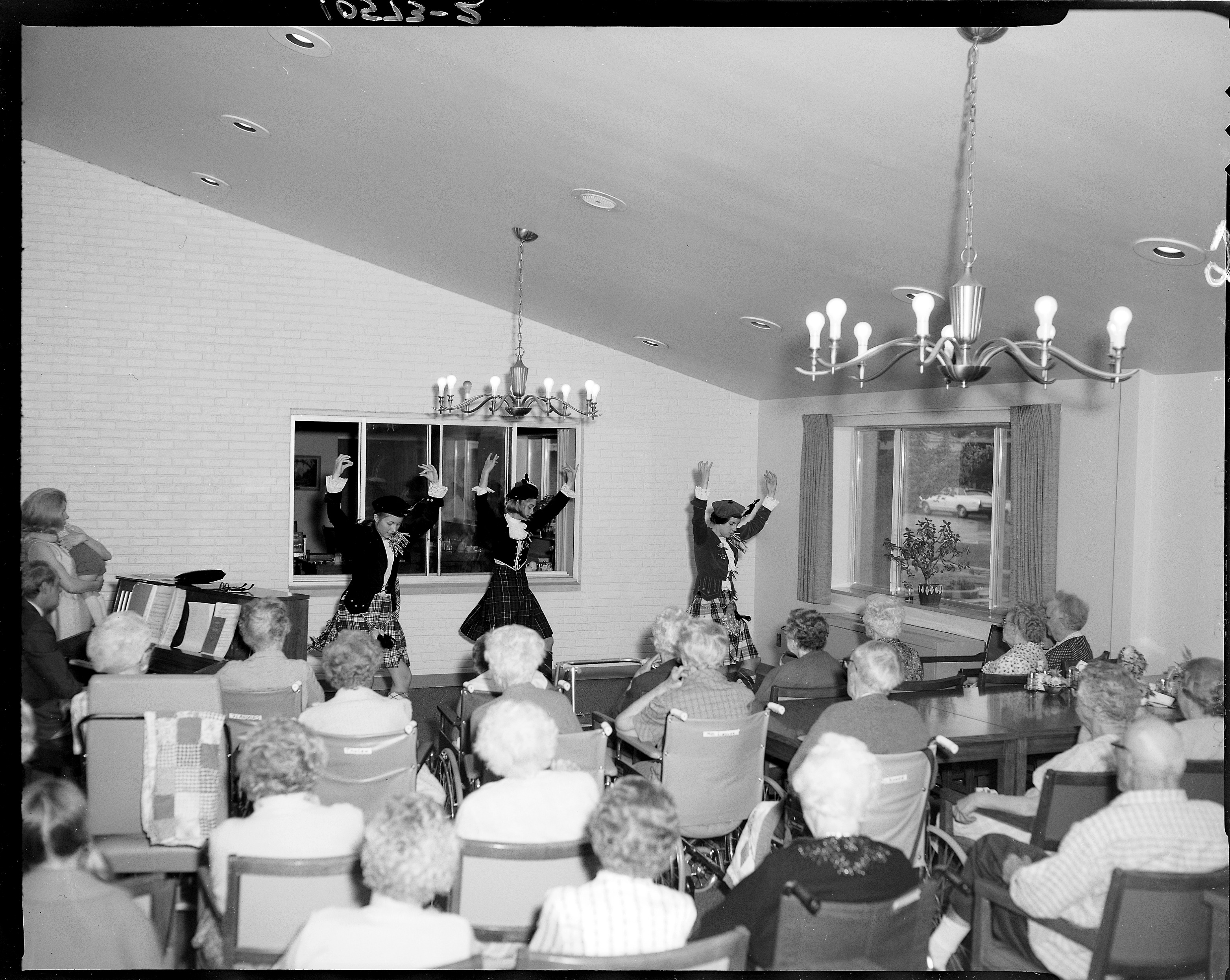 People - Daily Life. Three girls perform Scottish dance for residents of Harold and Grace Upjohn Community Nursing Home, Kalamazoo, Michigan. Client: Senior Citizens Home (Photographic Negative)