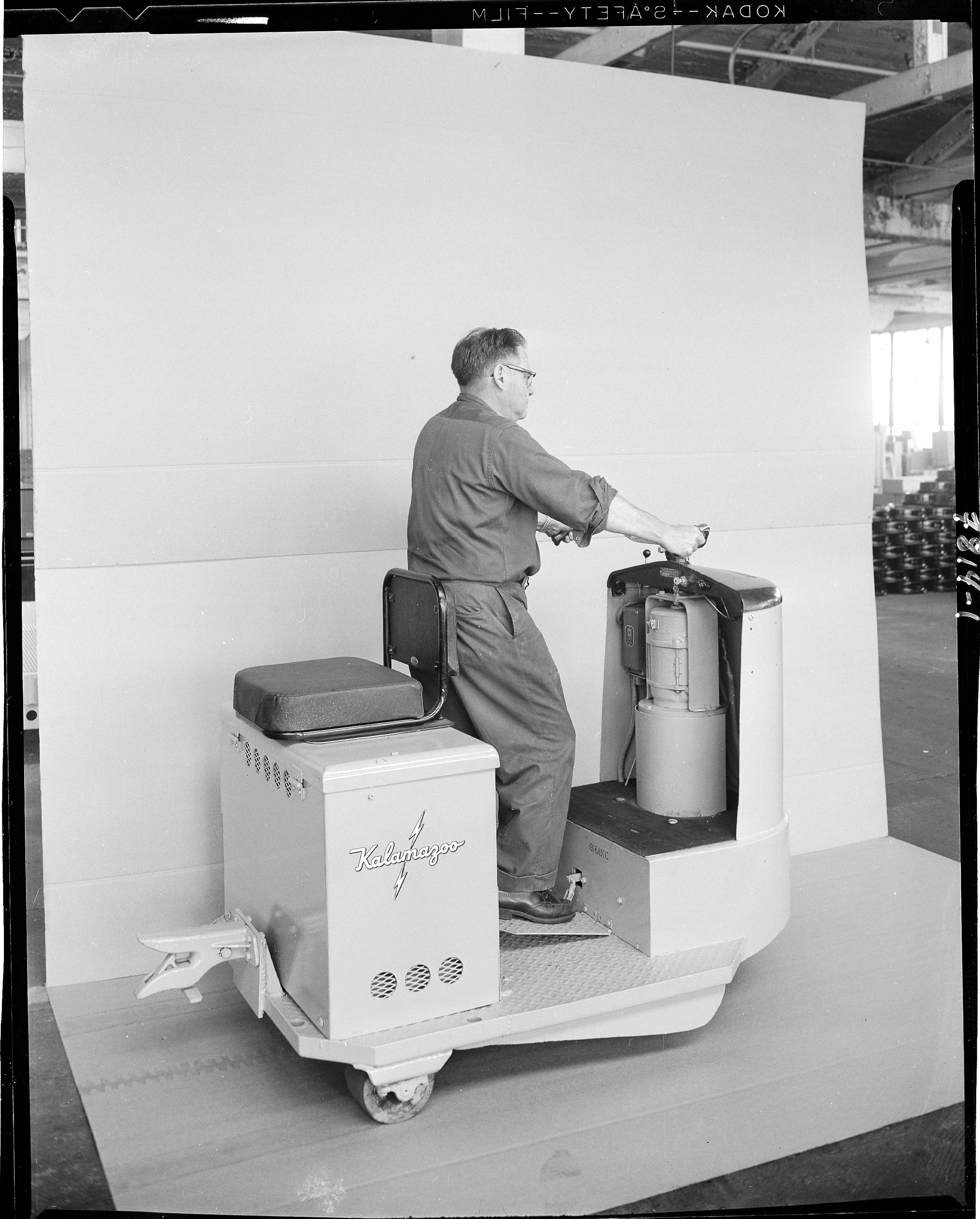 Industrial Products. Man in work clothes standing inside ""Kalamazoo"" brand velocipede railcar displaying ""Kalamazoo"" logo with lightning bolt. Interior of factory visible in background. Railcar includes towing hitch on rear. Client: Kalamazoo Manufacturing Company, Kalamazoo, Michigan. (Photographic Negative)