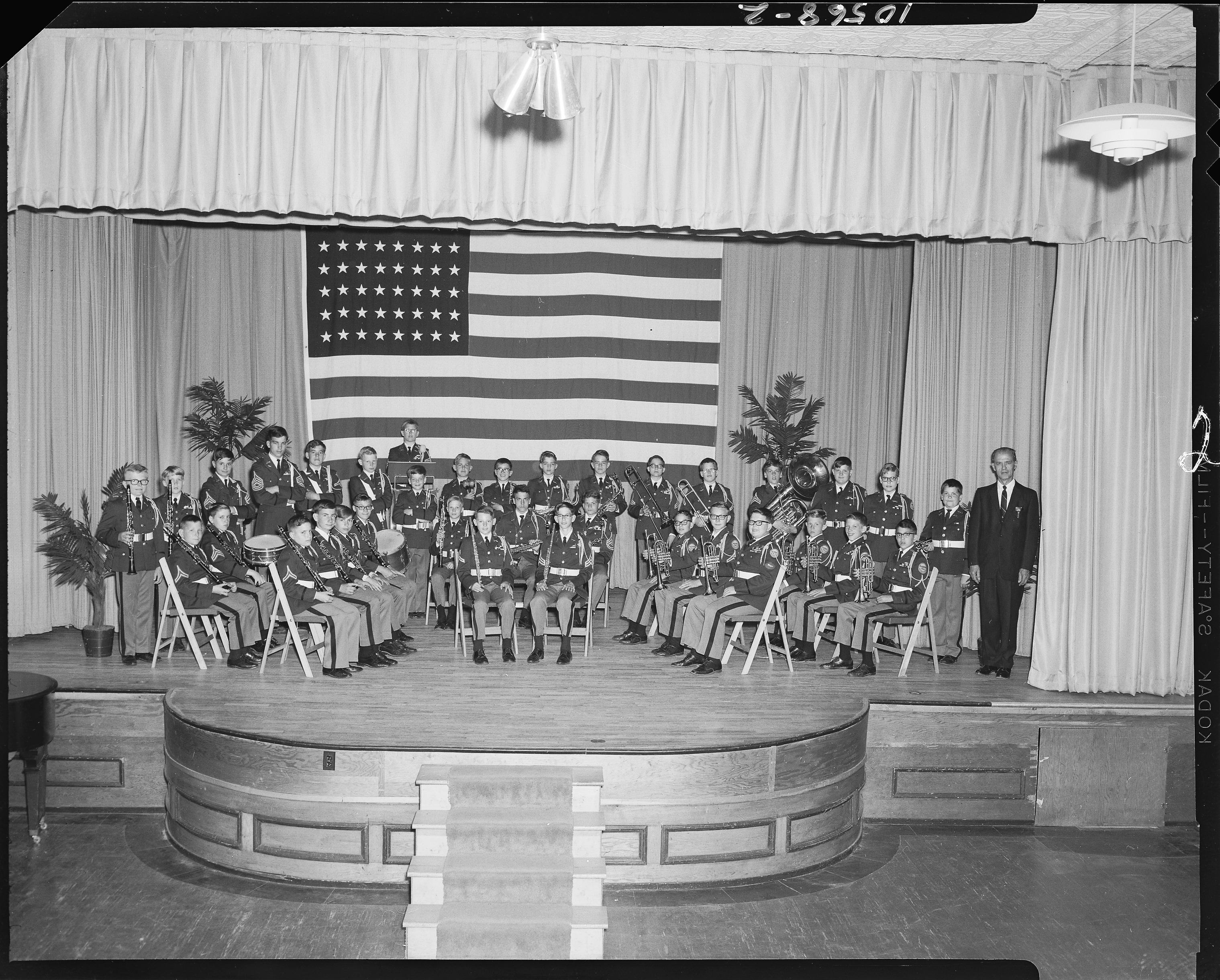 Education. Barbour Hall Academy Youth Band on stage with musical instruments, director. Large U.S. flag in background. Client: Sister Michel or Sister Theresa. (Photographic Negative)