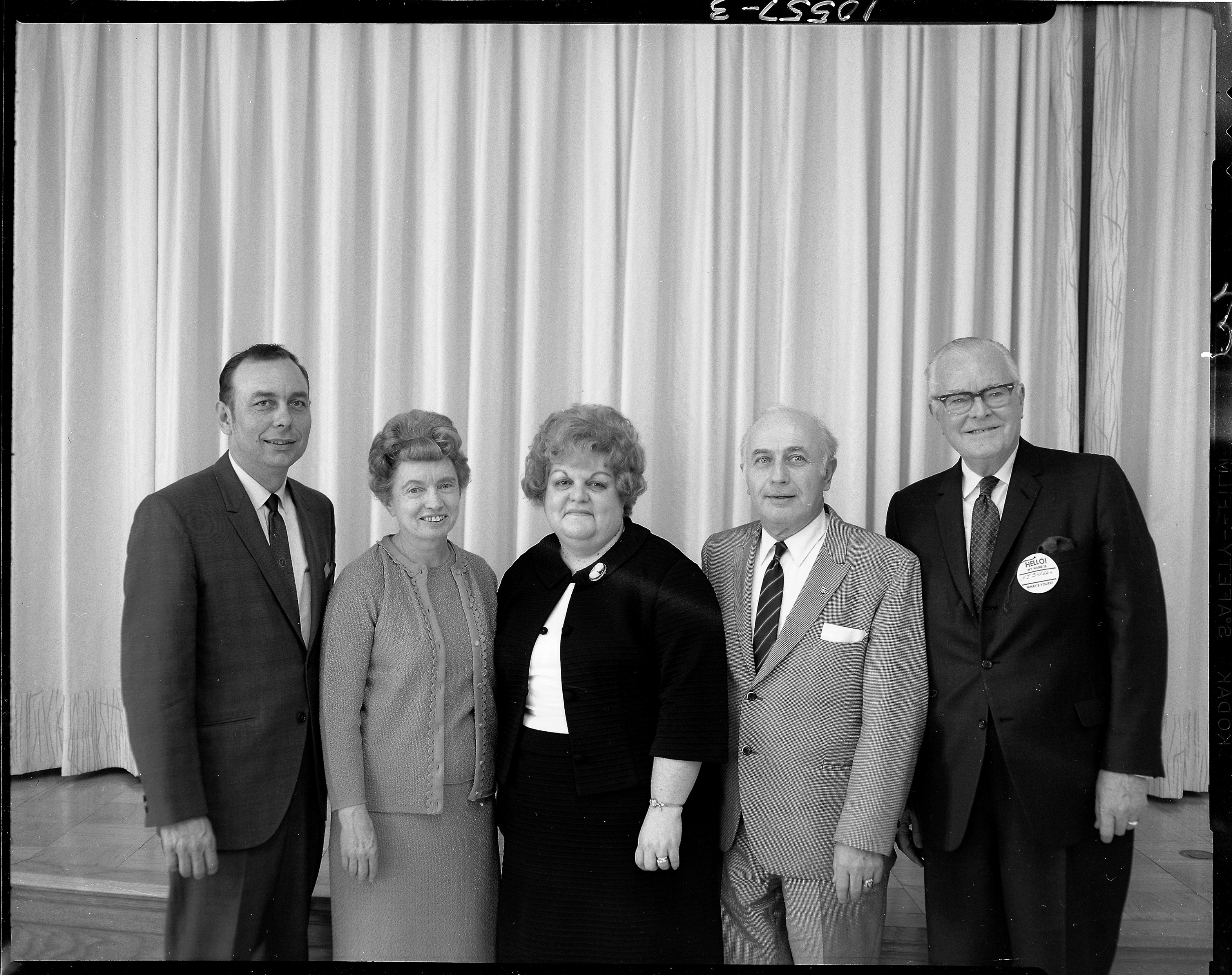 Education. Unidentified officers, three men and two women, Nazareth College. Kalamazoo, Michigan. April 22, 1969. Client: Nazareth College. (Photographic Negative)