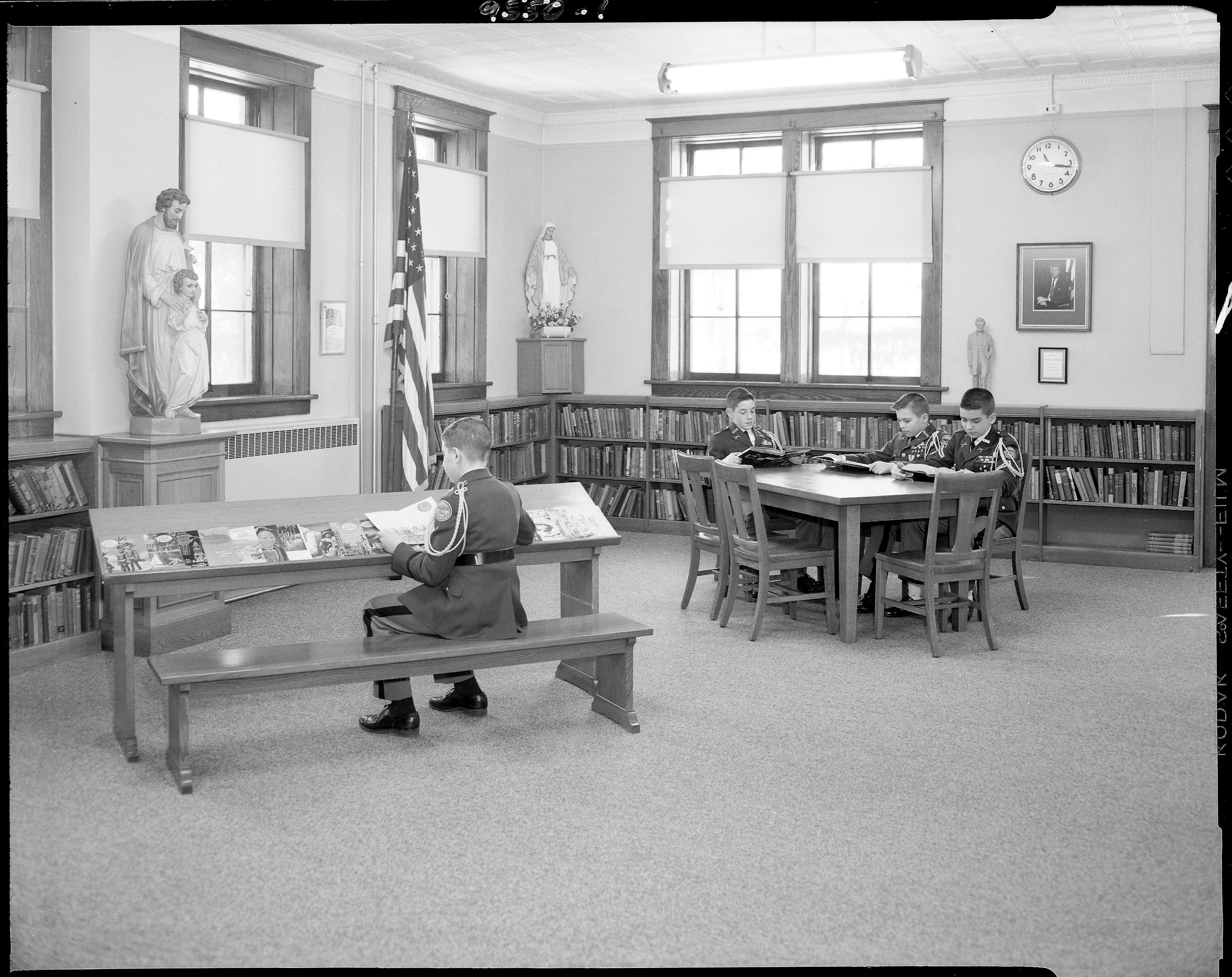 Education. Student cadets in library at Barbour Hall Junior Military Academy, includes books, reading tables, photograph of President John F. Kennedy, American flag, and statues of the Virgin Mary and St. Joseph with child Jesus. Client: James Lee Carpet Co., Wm. Oldham, Bridgeport, Pennsylvania (Photographic Negative)