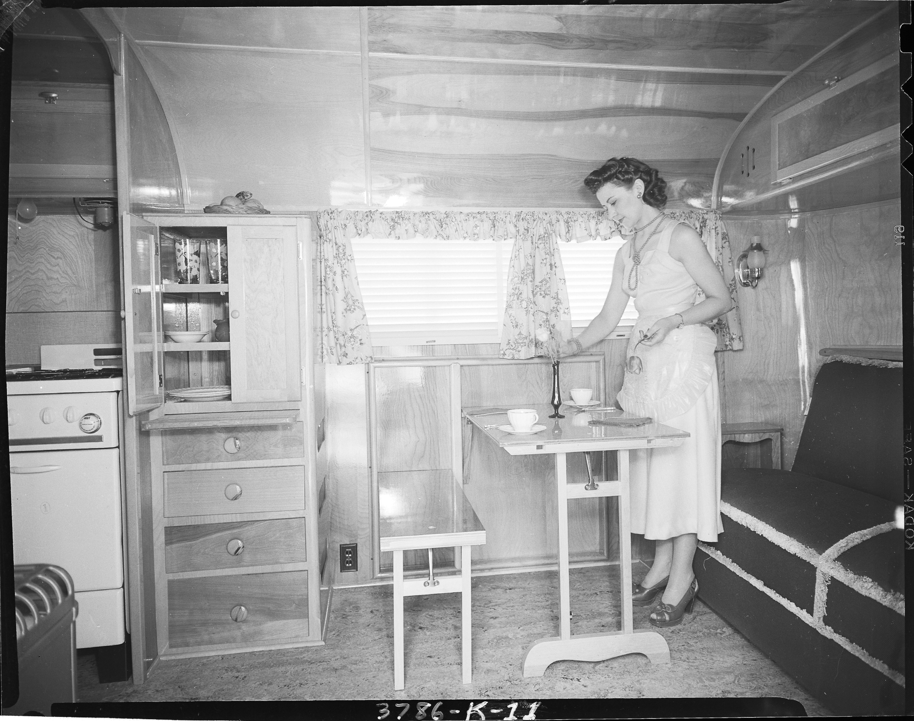 Business Products. Woman placing flowers in a vase on fold-out table set with china coffee cups and saucers, silverware, and cloth napkins inside. Dining/living area of Kozy Coach trailer. Woman is wearing heels, dress, jewelry, and elegant apron. Gas stove is partially visible in kitchen area. Wooden cabinet with drawers and half-open door reveals shelves holding glasses and tableware. Fold-down bench, couch with fur-like trim, wall lamp, overhead storage compartments, wood paneling, and windows with flower-patterned curtains and blinds also visible. Client: Kozy Coach Company, Kalamazoo, Michigan. (Photographic Negative)