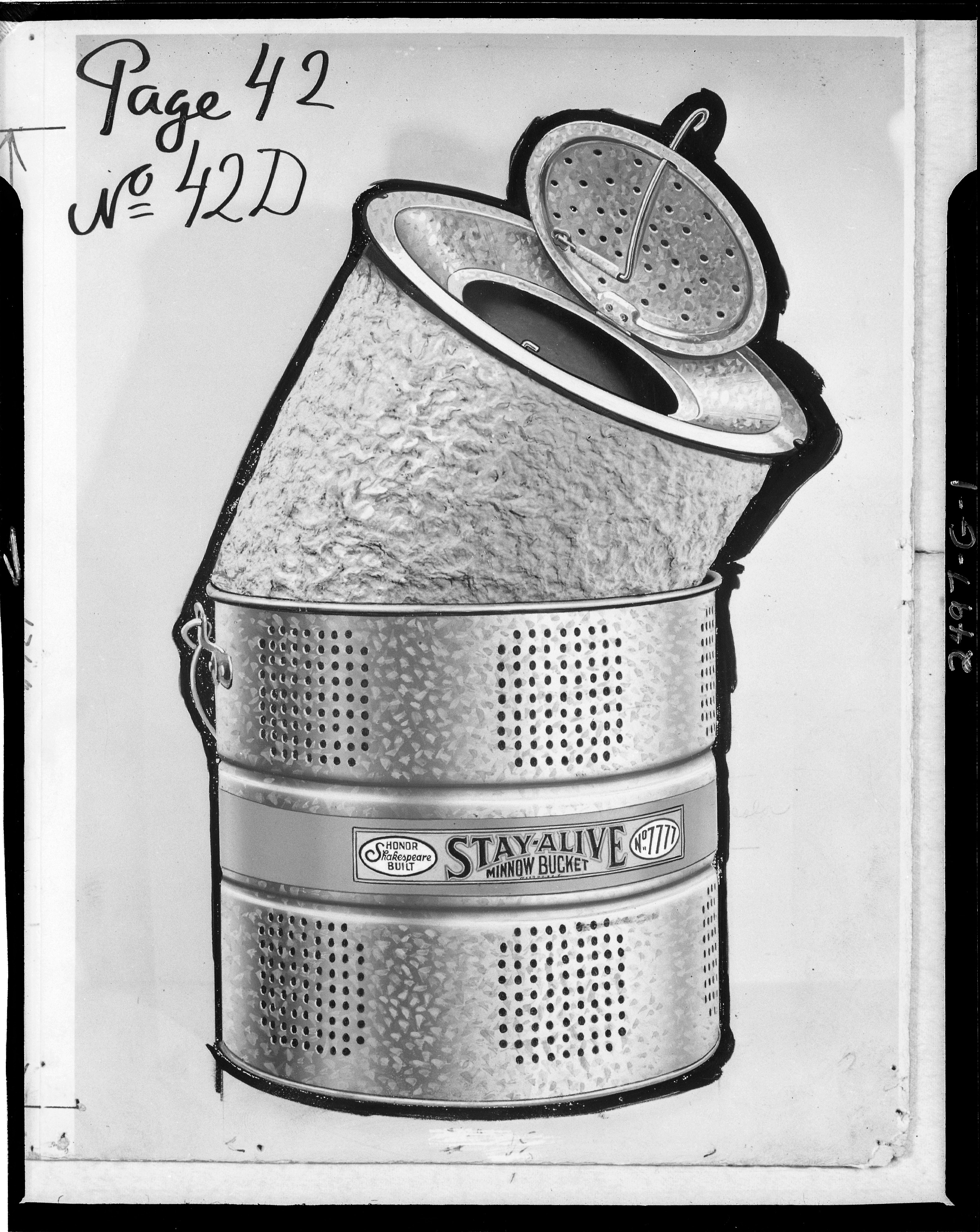 Business Products. Copy negative of ""Stay Alive Minnow Bucket"" produced by Shakespeare Company, Kalamazoo, Michigan. Client: Shakespeare Company (Photographic Negative)