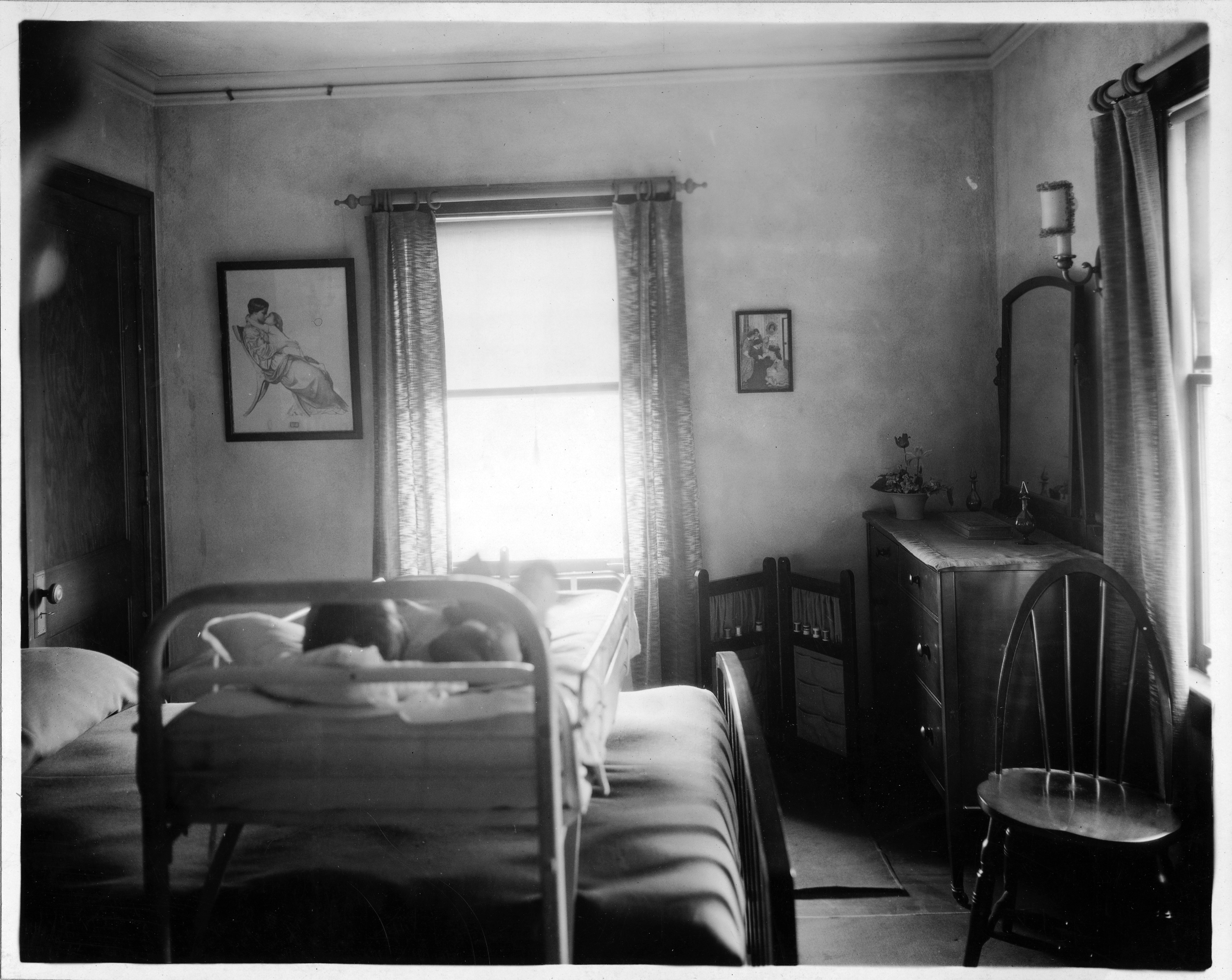 Photograph taken at "Everyman's House" located at 2026 S. Westnedge, Kalamazoo, Michigan, winner of the Better Homes in America 1924 Model Home contest, designed by Caroline Bartlett Crane. Interior of Mother's room with baby in small, fold-out crib placed over double-sized bed. Includes chair, bureau with mirror, windows with curtains, and small, wooden, two-paneled screen. Includes handwritten signature of photographer, Young, and note on back of photo, "Return to Caroline Bartlett Crane, 1425 Hillcrest Ave., Kalamazoo, Mich., View of Mother's room from kitchen door". Photograph is mounted on decorative gray board, extending approximately 1 3/4 from edge of photograph. (Photographic print)
