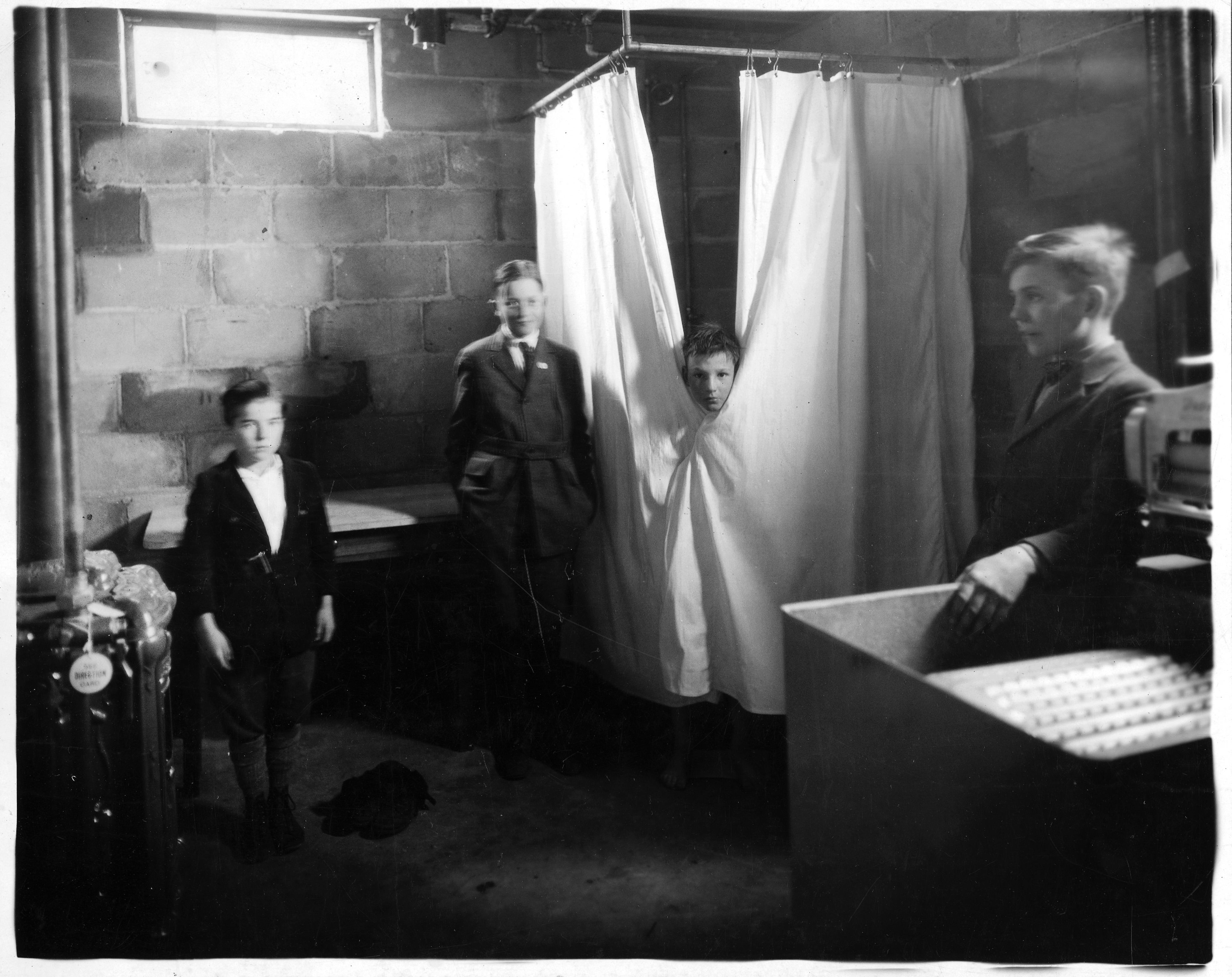 Photograph taken at "Everyman's House" located at 2026 S. Westnedge, Kalamazoo, Michigan, winner of the Better Homes in America 1924 Model Home contest, designed by Caroline Bartlett Crane. Four boys in jackets and knickers by basement shower, includes window, shower curtain, water heater, wringer-washer. Includes handwritten signature of photographer, Young, and note on back, "Basement shower". Photograph is mounted on decorative gray board, extending approximately 1 3/4 from edge of photograph. (Photographic print)