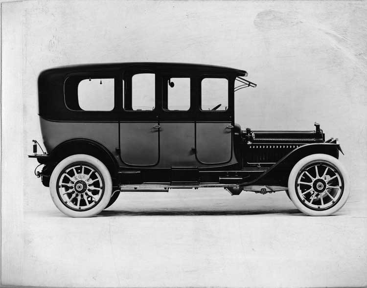 7.5x9.5 black and white Packard Co. file photograph of a 1914 Packard 48 right side, two-toned. Inscribed on photo back: 6-cylinder, 48-horsepower, 139-inch wheelbase, series third 48, 7-person imperial limousine.