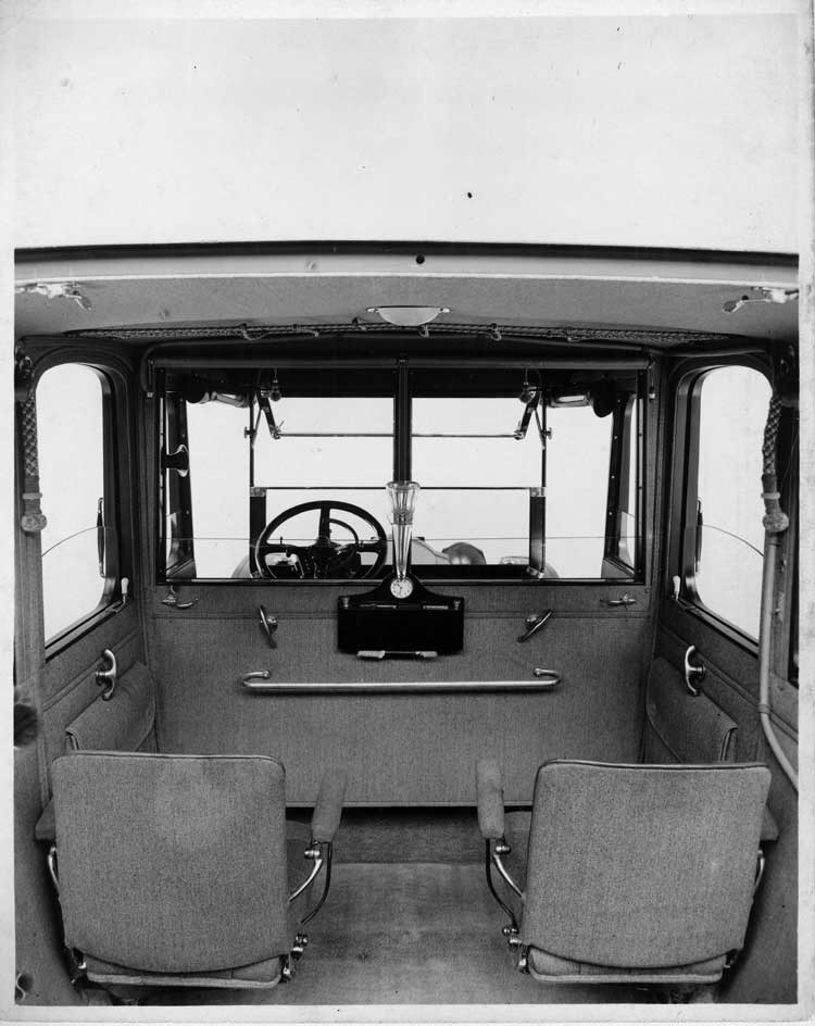 7.5x9.5 black and white Packard Co. file photograph of a 1914 Packard 48 view of interior through the opened back quarter. Inscribed on photo back: 6-cylinder, 48-horsepower, 139-inch wheelbase, series third 48, 7-person landaulet.