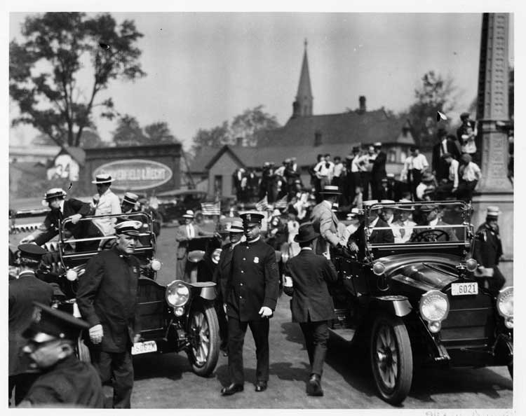 8x10 black and white Packard Co. file photograph of a two 1916 Packards with male drivers, parked on street, during a possible political rally, several American flags pictured, with several policemen, a journalist, and several male participants. Inscribed on photo back: Left: Packard 1-25, 12-cylinder, 88-horsepower, 135-inch wheelbase, first series, 5-person phaeton, 1916 Michigan license plate #5062M; right is a 1915 Packard 3-38, series third 38, 6-cylinder, 140-inch wheelbase, 6-person salon touring car, 1916 Michigan license plate #6021.
