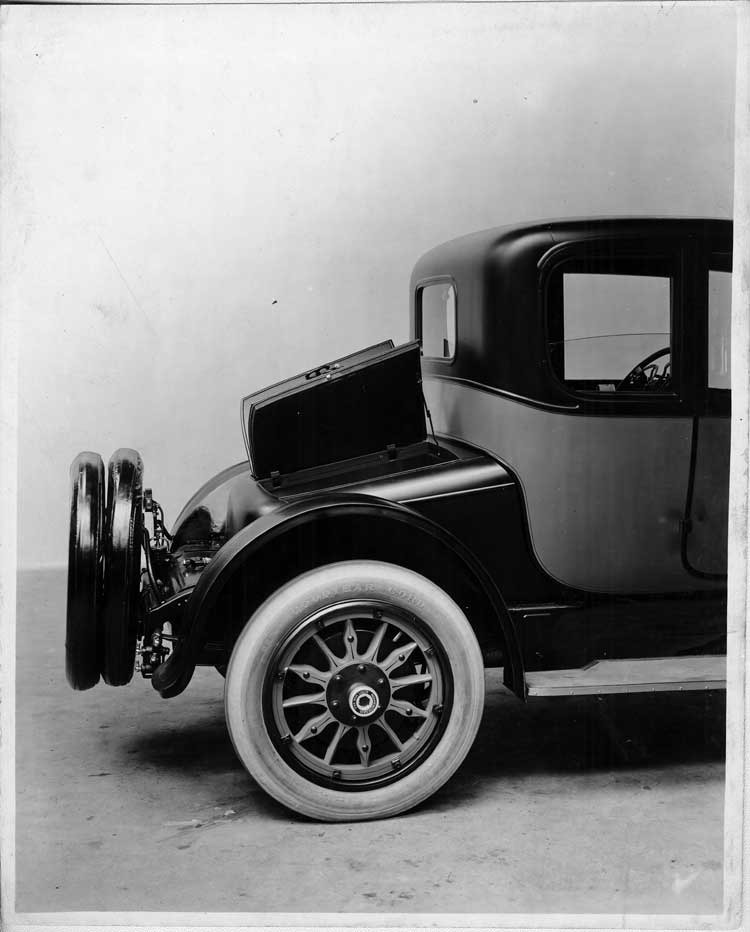 1917 Packard two-toned coupe, side rear view, compartment door opened