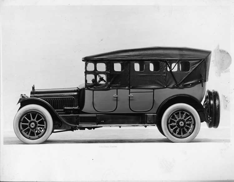 1917 Packard two-toned touring car, top raised, side curtains in place, left side view
