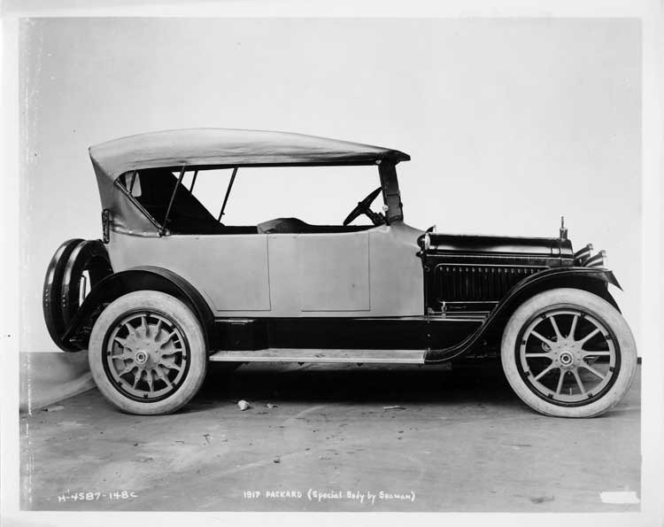 8x10 black and white Packard Co. file photograph of a 1917 Packard with a special body by Seaman, right side view, top raised, light in color, missing door handles, no trim work around doors.