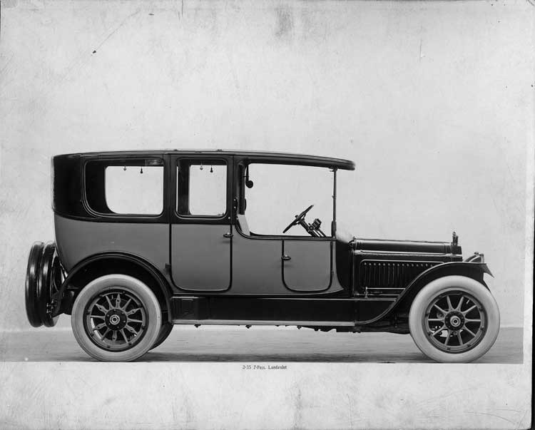 7.5x9.5 black and white Packard Co. file photograph of a 1917 Packard two-toned, right side view. Inscribed on photo back: 12-cylinder, 88-horsepower, 135-inch wheelbase, 2-35 second series twin six, 7-person landaulet (body type #163).