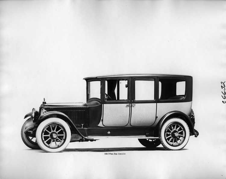 8x10 black and white Packard Co. file photograph of a 1918 Packard nine-tenths left front view, two-toned, no cover on spare tire, back tires and spare have diamond-shaped treads. Inscribed on photo back: Model 3-35, 7-person imperial limousine.