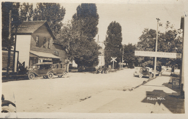 Black and white postcard of Helena street, downtown Alden, Michigan, looking east, ca. 1925