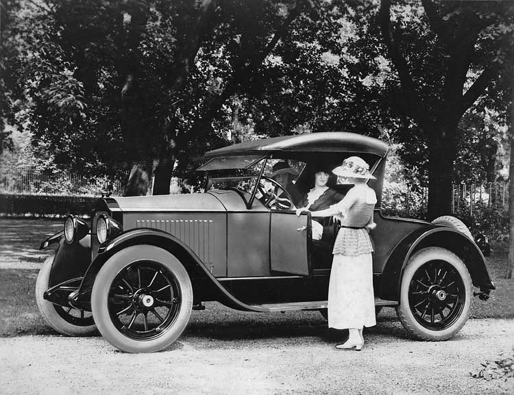 7.5x9.5 black and white photograph of a 1921-1922 two-toned Packard female driver and passenger, female standing at driver's side with door open. Inscribed on photo back: Packard 116 first series single six, 6-cylinder, 52-horsepower at 2400 rpm (produced 9/1/1920-4/20/1922), 116-inch wheelbase, 4-person coupe (body type #191), five-sixths left front view, top raised.