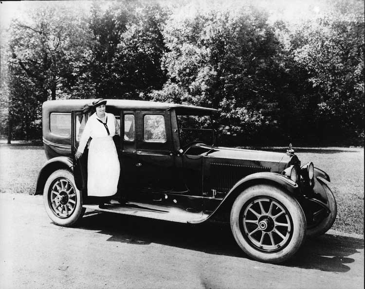 1920-1923 Packard touring car, woman in middy stepping out of passenger door