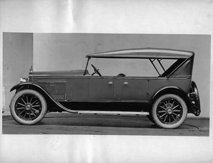 7.5x9.5 black and white photograph of a 1922-1923 Packard left side view. Inscribed on photo back: Packard 133, first series single-six (produced 4/20/1922-12/27/1923), 6-cylinder, 54-horsepower, 133-inch wheelbase, 7-person touring car (body type #225), left elevation, top raised.