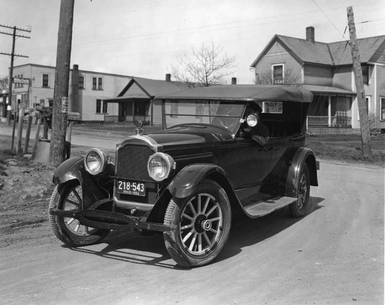 8x10 black and white Packard Co. file photograph of a 1923 Packard three-quarter front view, top raised, coming around street corner, male driver. Inscribed on photo back: Model 126, 5-person touring car.