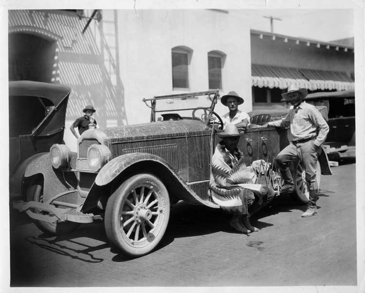 8x10 black and white Packard Co. file photograph of a 1924 Packard, mud-spattered, front view, top lowered, male driver, two males at driver's side, one standing and other sitting on running board wrapped in Native American blanket, all in cowboy hats. Inscribed on photo back: Packard 226, second series six (produced 12/27/1923-2/2/1925), 6-cylinder, 54-horsepower, 126-inch wheelbase, 5-person touring car (body type #220), 1925 California license plate #D 208, photographed in the Arizona Indian country.