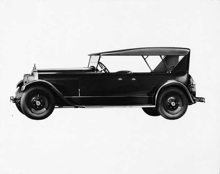 7.5x9.5 black and white Packard Co. file photograph of a 1925-1926 Packard left side view, top raised. Inscribed on photo back: Packard 243, second series eight (produced 2/2/1925-8/1/1926), 8-cylinder, 85-horsepower, 143-inch wheelbase, 7-person touring car (body type #245), early type two-piece windshield.