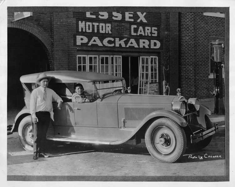 8x10 black and white Packard Co. file photograph of a 1925-1926 Packard, three-quarter right front view, top raised, Native American female in front passenger seat, young boy standing at her side. Inscribed on photo back: Packard 236, second series eight (produced 2/2/1925-8/1/1926), 8-cylinder, 85-horsepower, 136-inch wheelbase, 4-person sport model (body type #246), fitted with special radiator cap, early type two-piece windshield. Photographed outside a small Essex Packard agency, probably in Oklahoma.