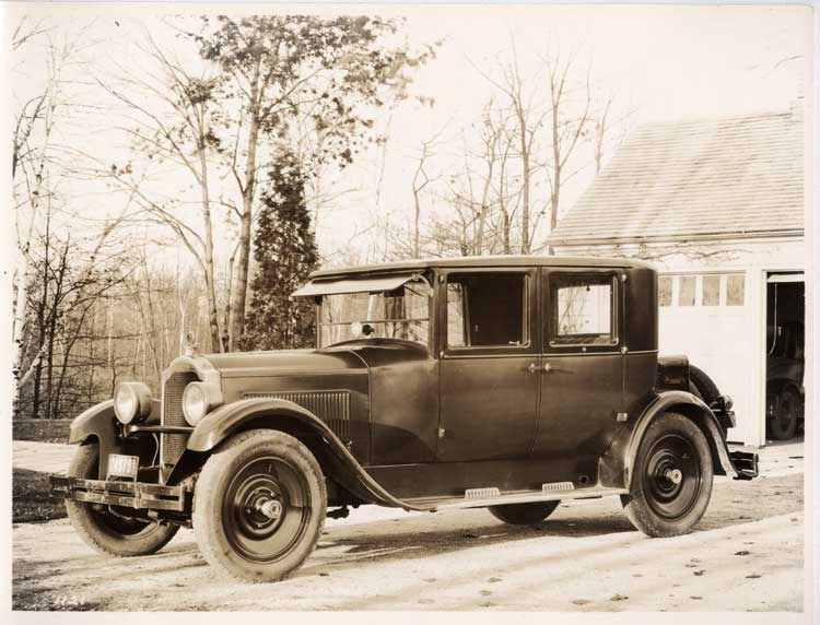 8x10 black and white sepia-toned Packard Co. file photograph of a 1925-1926 Packard three-quarter left front view, parked in front of garage. Inscribed on photo back: Packard 333, third series six, 6-cylinder, 60-horsepower, 133-inch wheelbase, 5-person club sedan (body type #265), L.S. Peregoy--Milwaukee, Model 3-33 club sedan, delivered 8/19/25, mileage 75,660, motor overhauled at 37,530 miles.