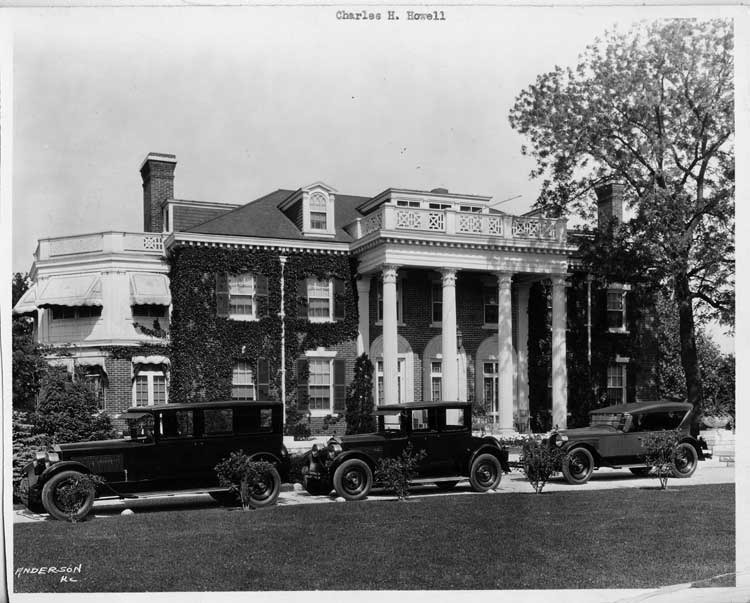 7.5x9.5 black and white Packard Co. file photograph of a 1925-1926 Packards left side view, sedan limousine, coupe, & sport model, lined up in front of large brick home. Inscribed on photo back: left to right Packard 243, second series eight (produced 2/2/1925-8/1/1926), 8-cylinder, 85-horsepower, 143-inch wheelbase, 7-person sedan limousine (body type #256) 1925 Missouri license plate #11-235, Packard 326, third series six (produced 2/2/1925-8/1/1926), 6-cylinder, 60-horsepower, 126-inch wheelbase, 4-person coupe (body type #222), 1925 Missouri license plate #11-229, Packard 326, third series six (produced 2/2/1925-8/1/1926), 6-cylinder, 60-horsepower, 126-inch wheelbase, 4-person sport model (body type #224), all are early types note two-piece windshields, & 5-lug wheels on sixes, photographed before residence of Charles H. Howell, prominent Kansas City attorney, who purchased all three cars at one time from Packard.