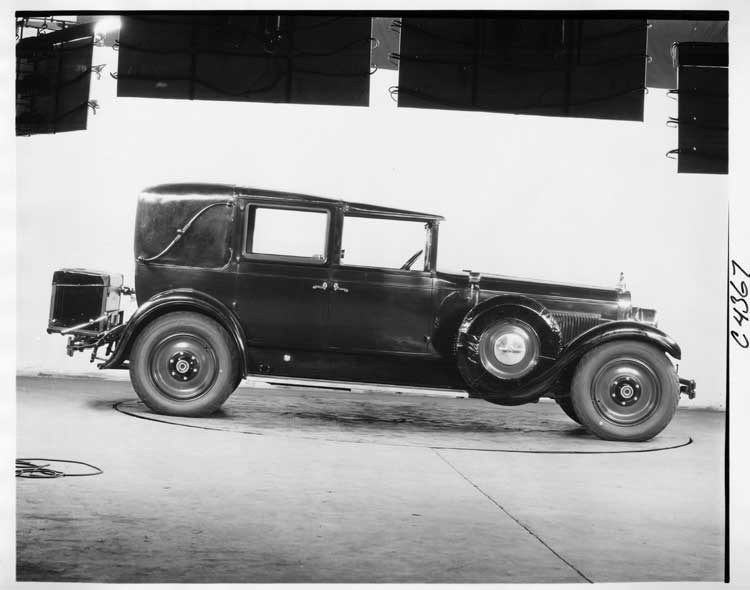 8x10 black and white Packard Co. file photograph of a 1926 Packard right side view. Inscribed on photo back: Packard Model 343, all weather town cabriolet, body by Dietrich.